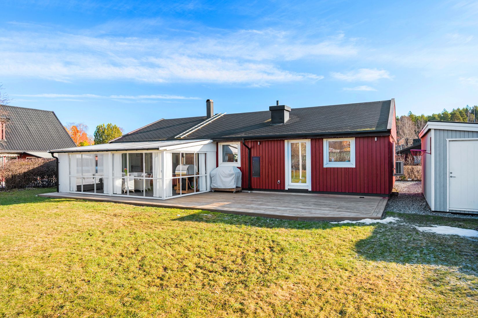 Utomhusmiljön är minst lika inbjudande. Här finns ett stort inglasat uterum samt en generös altan om cirka 80 kvm som skapar fantastiska möjligheter till umgänge, grillkvällar och avkoppling. Tomten erbjuder även förråd, lekstuga och flaggstång.