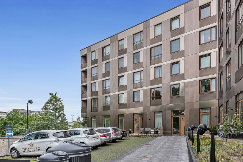 Sovrummet är rymligt med gott om garderobsförvaring, medan det stilrena badrummet imponerar med sina påkostade detaljer. Boendet ligger i den populära Brf The Bronze, där medlemmarna kan njuta av en gemensam takterrass.