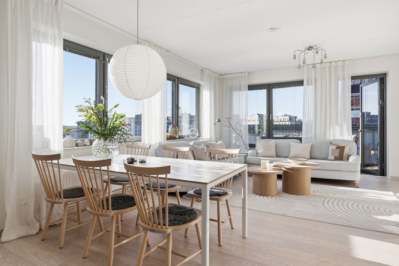 De sociala ytorna – vardagsrum, kök och inglasad balkong – ligger i direkt anslutning till varandra och bjuder på en härligt ljus och luftig atmosfär.