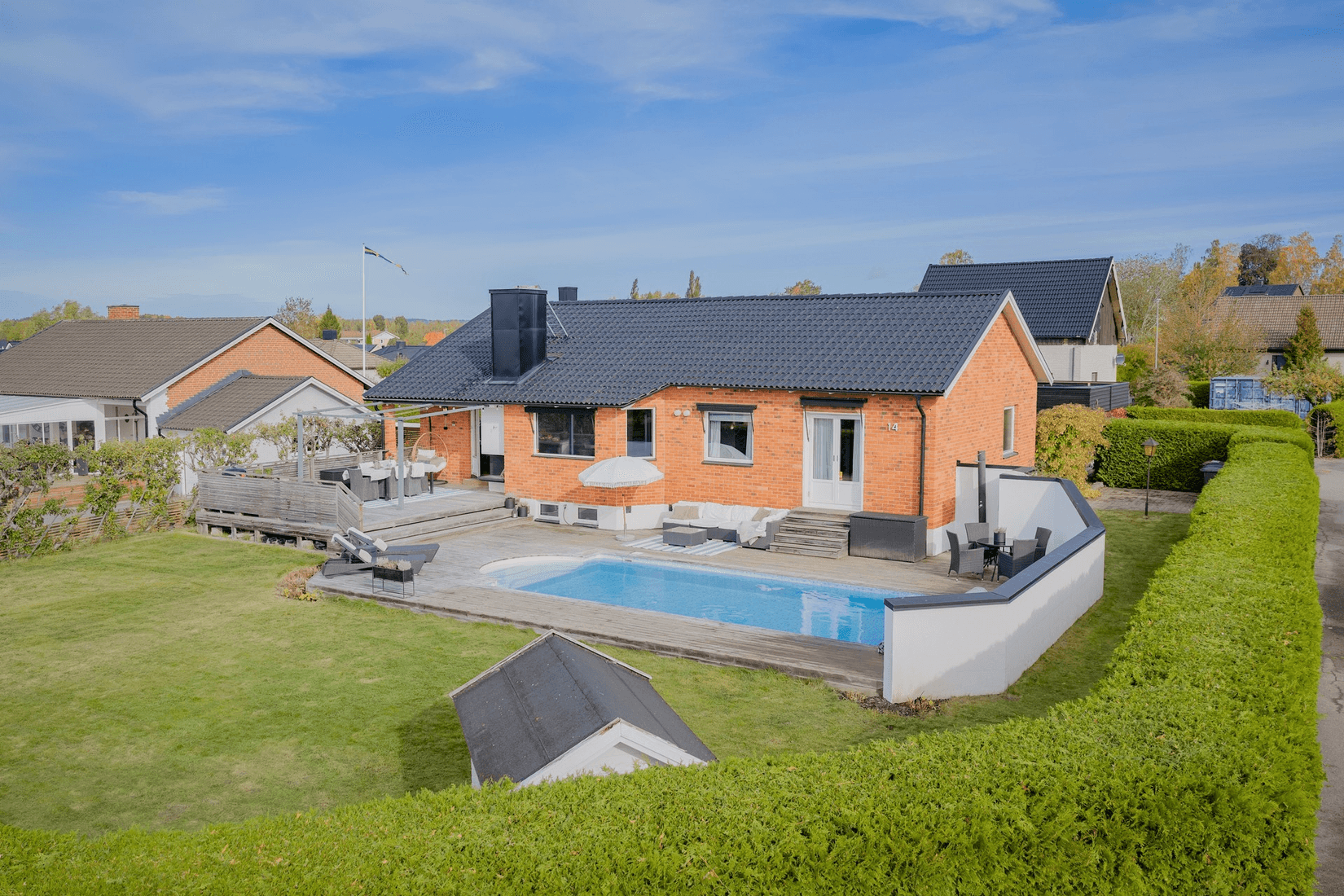 Den ombonade trädgården bjuder in till sköna dagar utomhus. Poolområdet skapar en härlig semesterkänsla på hemmaplan och den generösa altanen med öppen spis ger extra guldkant året runt, från ljumma sommarkvällar till mysiga vår- och höstdagar där man kan grilla korv i den öppna spisen efter lek i trädgården. Det stora dubbelgaraget erbjuder gott om plats för både bilar och förvaring samt uppfart för extra parkering.