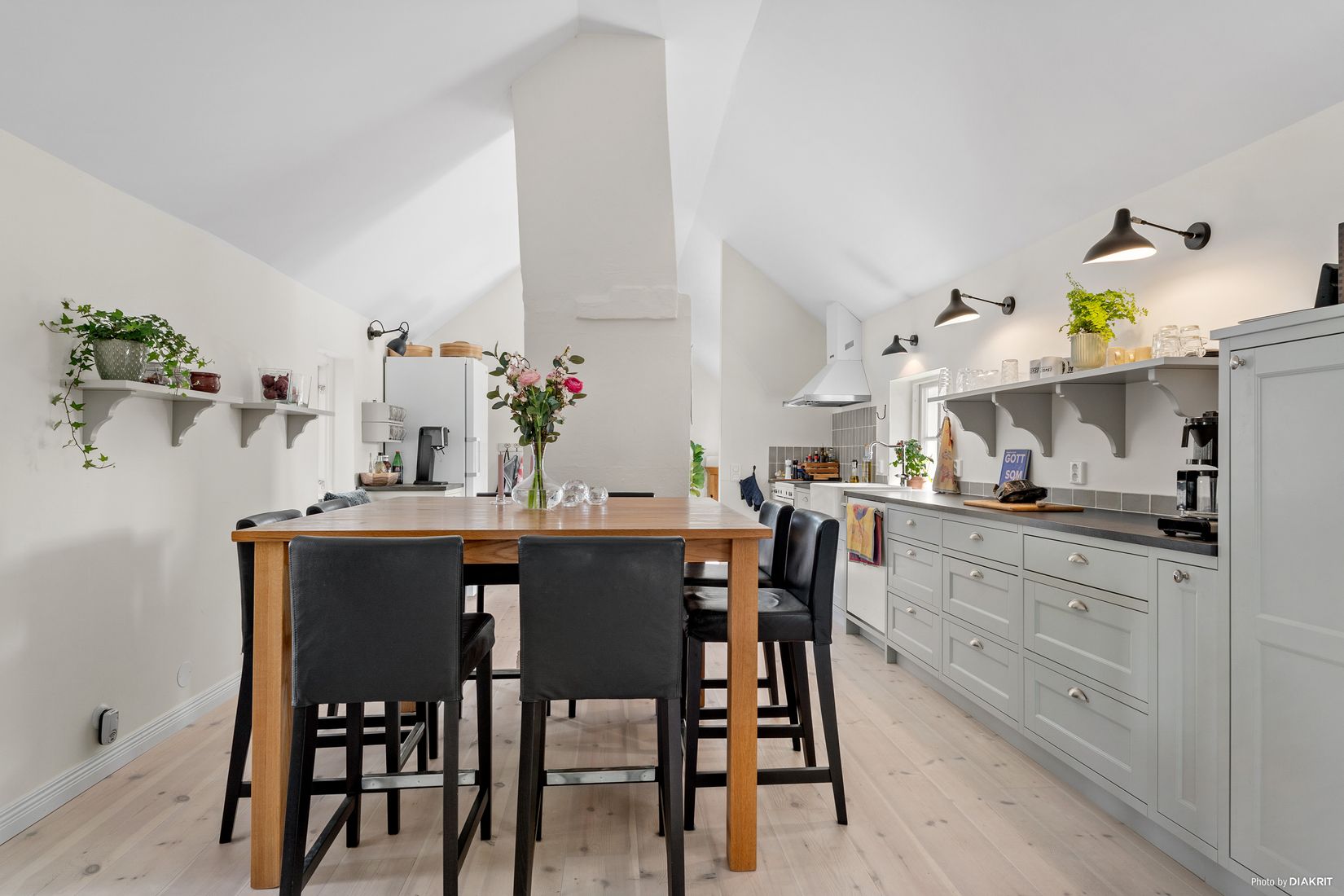 Via halvtrappan når du köket, renoverat 2021 med varmgrå luckor från Marbodal och charmiga detaljer som bevarar husets själ. Härifrån har du fin kontakt med vardagsrummet, och båda rummen präglas av vitlaserat trägolv från Rappgo och generös takhöjd som förstärker ljuset och rymden.