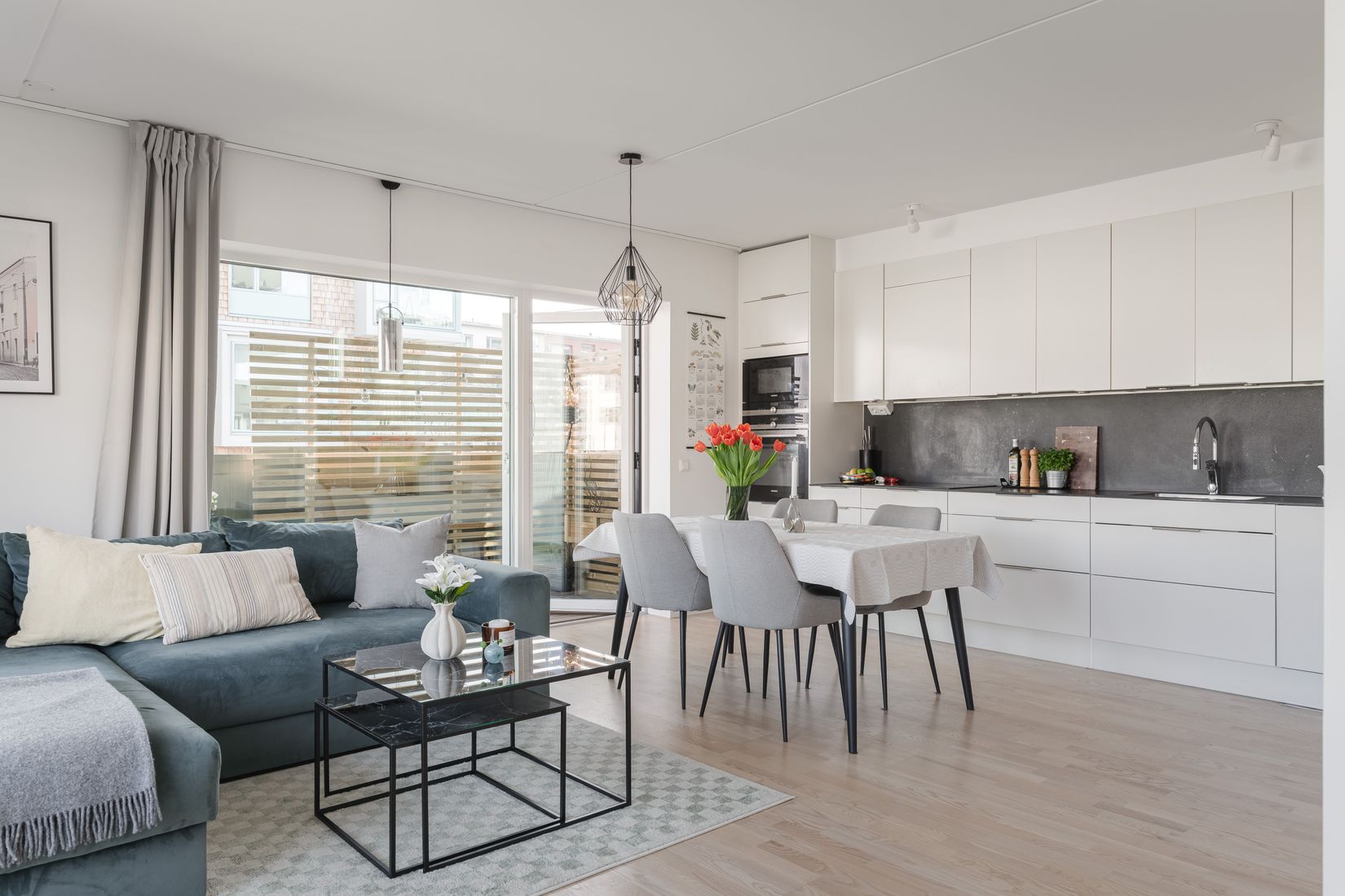 Vardagsrummet erbjuder gott om plats för både en bekväm soffgrupp och en rymlig matplats. Tack vare bostadens hörnläge fylls rummet av generöst ljusinsläpp som skapar en inbjudande atmosfär. Härifrån nås även den fantastiska hörnbalkongen – en perfekt plats för avkoppling med utsikt över havet. Balkongen rymmer enkelt loungemöbler, växter och annat som förhöjer trivseln, och blir en naturlig samlingspunkt under både soliga dagar och ljumma kvällar.