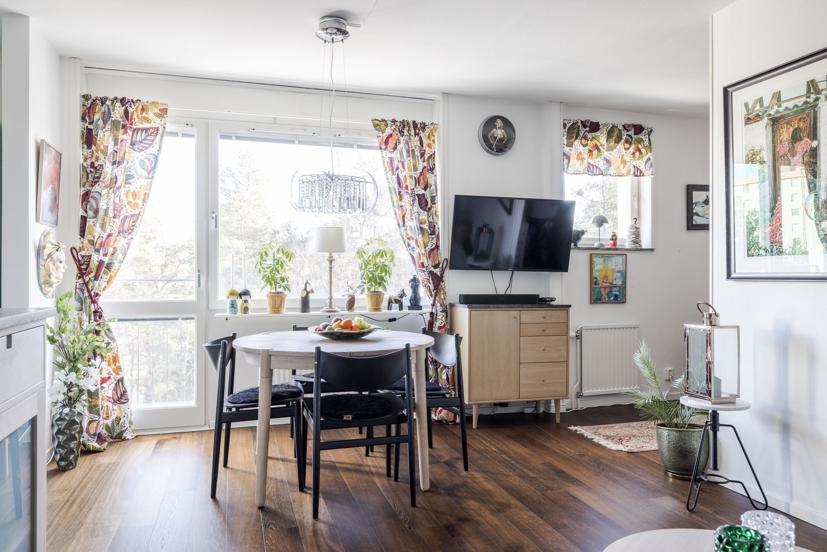 De stora fönsterpartierna släpper in rikligt med ljus och skapar en luftig och trivsam atmosfär i hela bostaden.