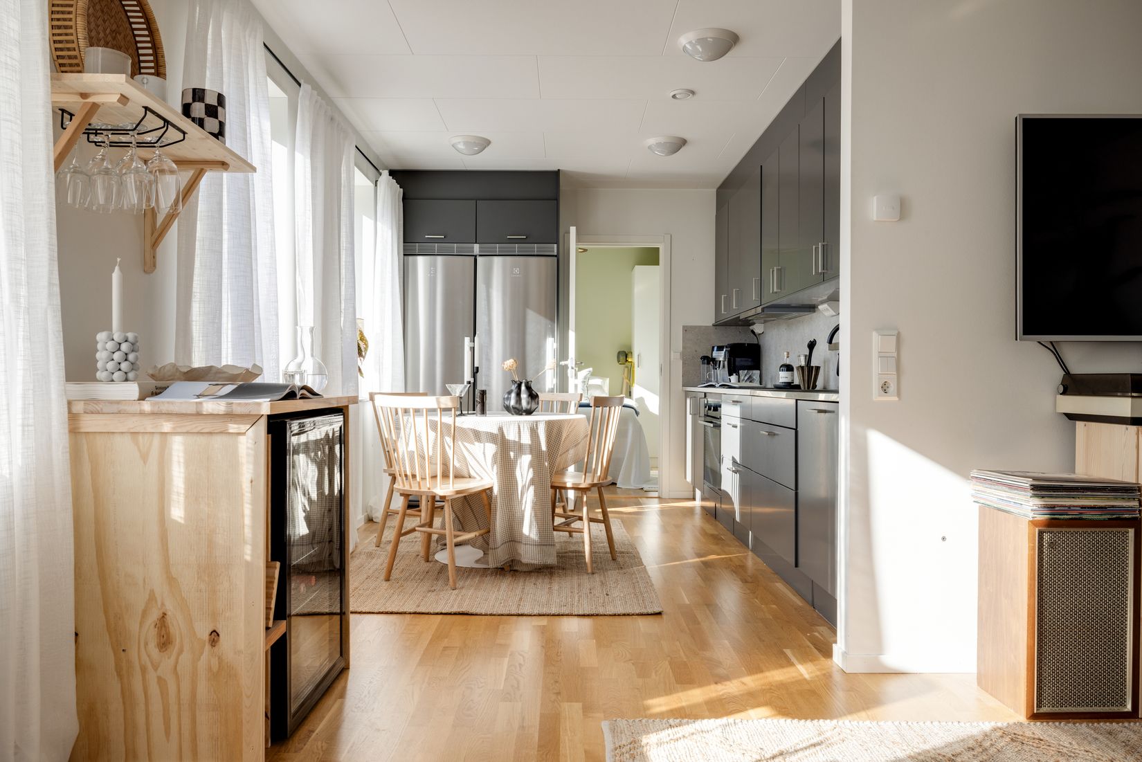 Bostaden har en öppen och social planlösning mellan kök och vardagsrum med ljusinsläpp som skapar en luftig och inbjudande atmosfär. Här finns gott om plats för både soffgrupp och matbord – idealiskt för vardag och fest. Två rymliga sovrum med smarta möblerings möjligheter gör bostaden flexibel. Förvaringen är väl genomtänkt med praktisk klädkammare samt ett eget förråd i nära anslutning till bostaden.