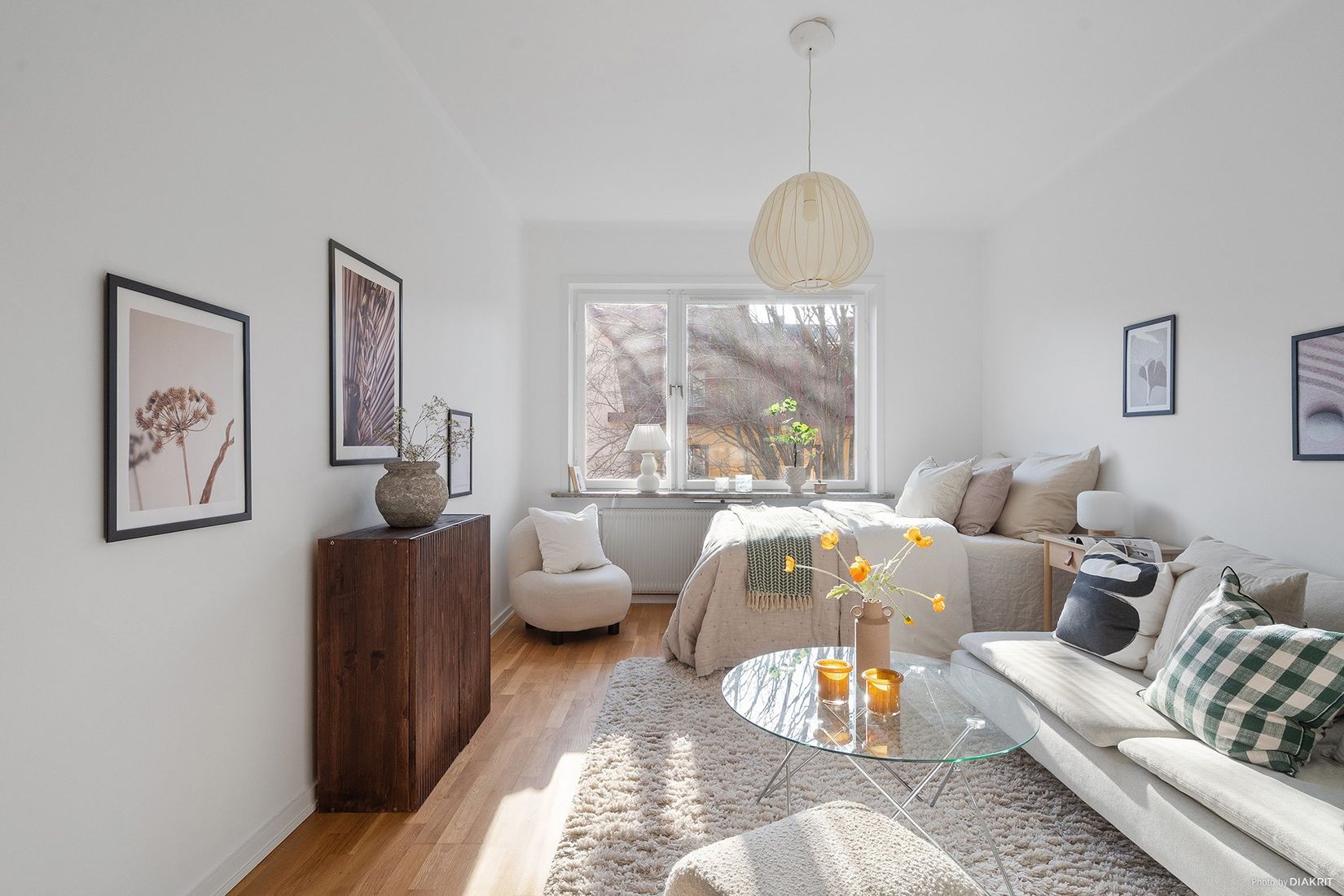 Bostadens hjärta är verkligen det rymliga och trivsamma allrummet - med generöst ljusinsläpp från ett stort fönsterparti mot föreningens lugna baksida. Den smarta planlösningen ger gott om plats för både bredare säng, soffgrupp och förvaring – perfekt för både en eller två!