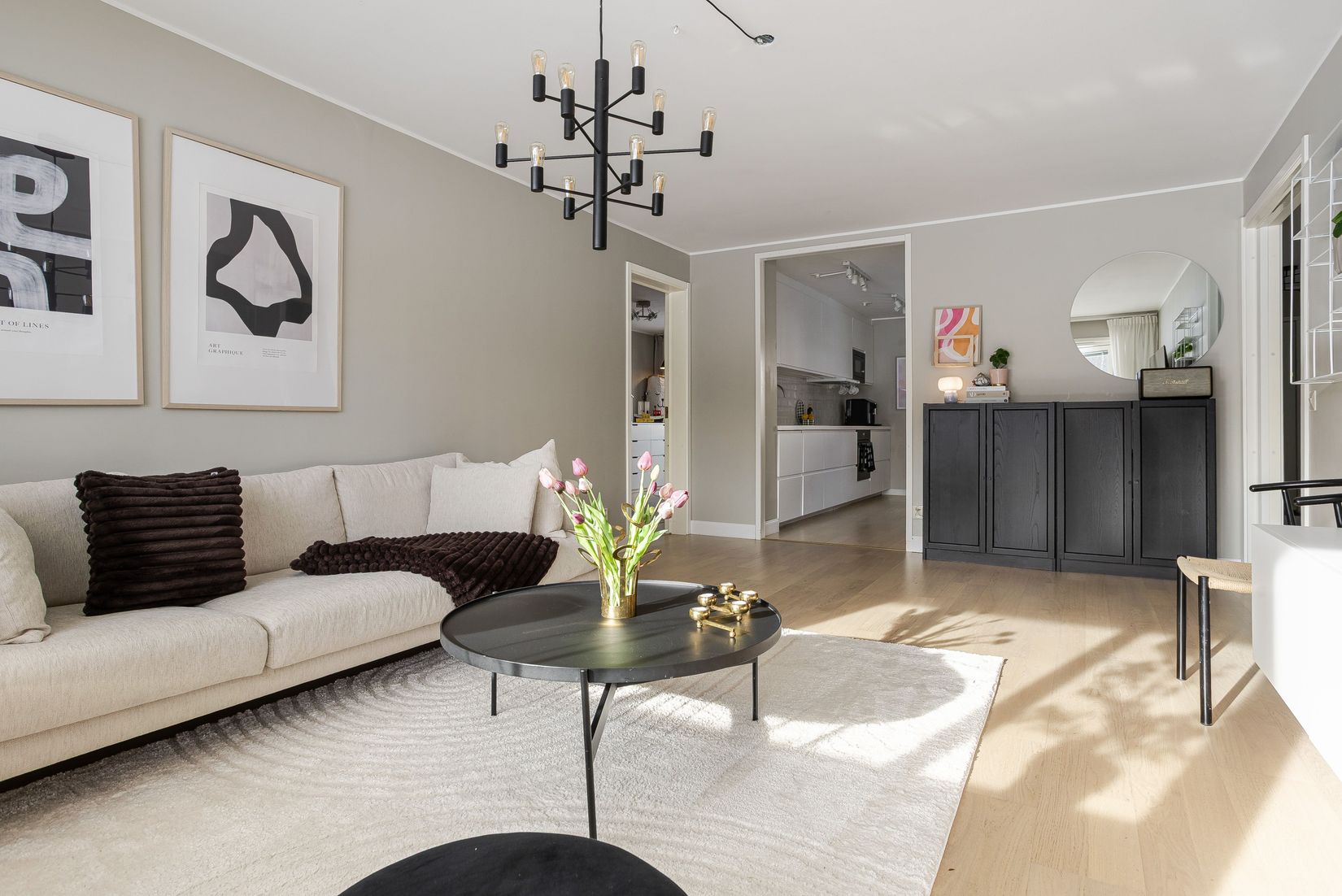 Det ljusa och öppna vardagsrummet erbjuder generösa ytor med plats för en större soffgrupp och sociala möbleringar. Härifrån når du bostadens inbjudande altan i vinkel, belägen i ett härligt solläge.