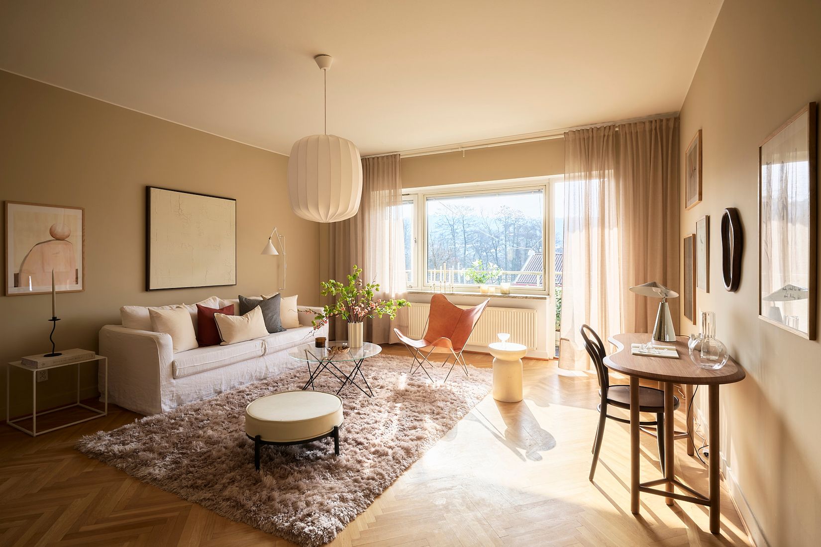 Ett hem som blivit minutiöst renoverat till toppklass, utan att tumma på något! De vackra materialvalen samsas med de fina originaldetaljerna och skapar en härlig kombo av 1940-talet och modern elegans. Vackra dörrar i original, charmig fiskbensparkett och djupa fönsterbrädor är bara några av detaljerna som bevarats för att känna igen vad som en gång var 1940-tal. Kombinerat med modernt kök med integrerade vitvaror och vinkyl, helkaklat badrum med stora eleganta kakelplattor samt hög standard på ytskikten i hela bostaden så upplevs detta som ett komplett hem.