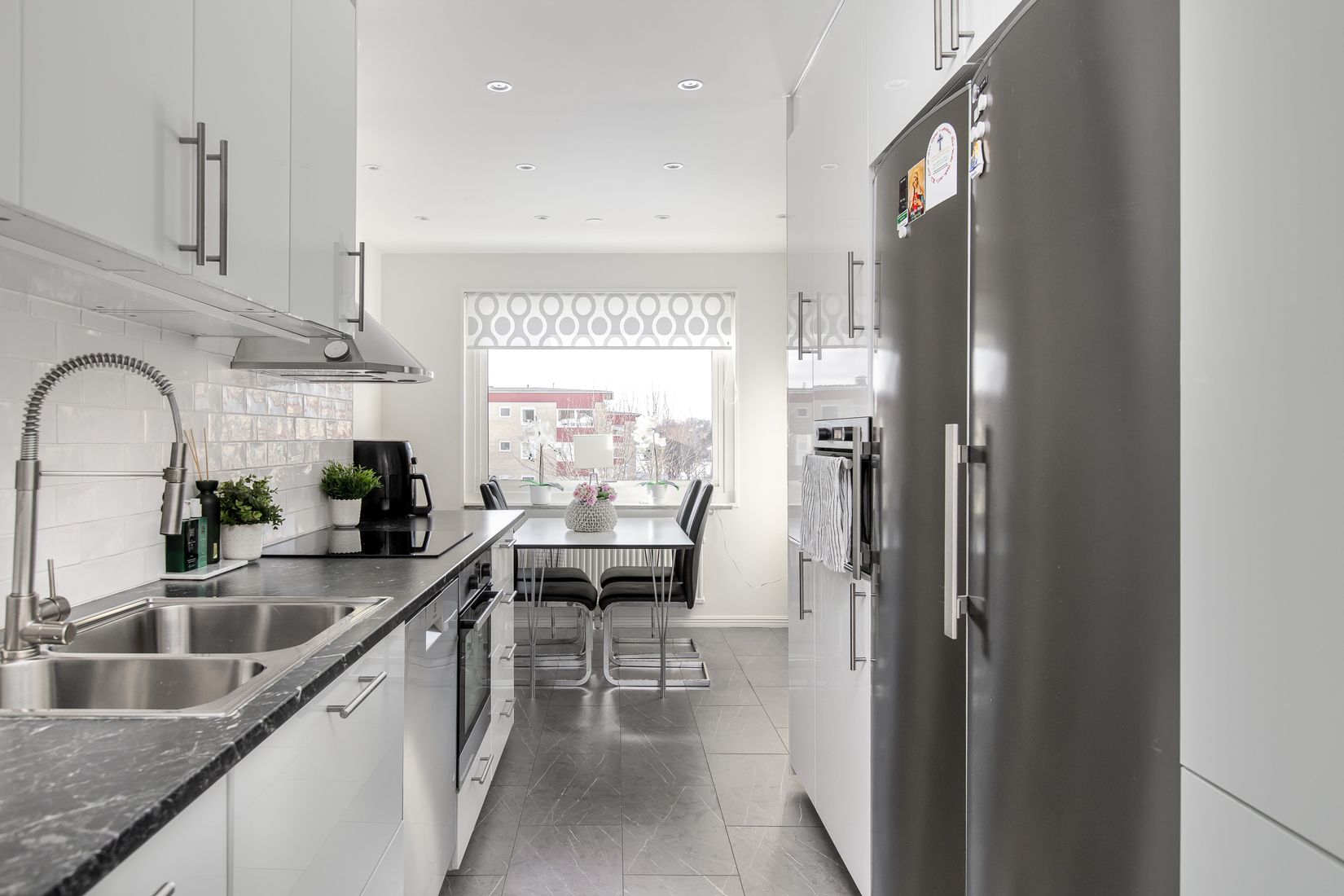 Köket är modernt och smakfullt utformat med stilrena snickerier, arbetsytor samt matchande stänkskydd. Här finns en komplett maskinpark med kvalitativa vitvaror såsom varmluftsugn, integrerad helkyl och helfrys, vilket skapar en både praktisk och exklusiv arbetsmiljö för den matlagningsintresserade.
