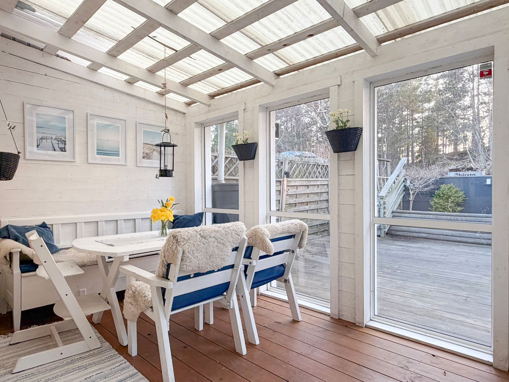 Välkommen till detta välplanerade radhus med ett fint läge på Sandhamn. Husets baksida är en insynsskyddad oas med utmärkt solläge. Här finns en rymlig altan och ett inglasat uterum med stora fönsterpartier mot baksidan som gör att man kan njuta av platsen under stora delar av året. Invändigt rymmer huset tre bra sovrum, två moderna och helkaklade badrum, allrum med eldstad och utrymme för stor matplats samt ett praktiskt kök och en ännu mer praktisk tvättstuga med groventré precis intill! På husets framsida finns en trivsam altan och ett förråd. Entréhallen är tillbyggd för att ge mer plats till vardagsbestyren med på- och avtagning samt förvaring av ytterkläder.