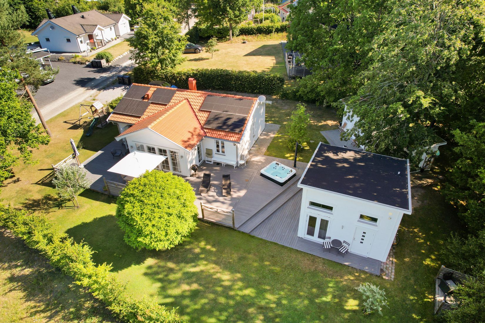 På tomten finns ett stort trädäck mellan hus och gästhus. I trädäcket finns nersänkt spabad och trädäcket har plats för flera möblemang
