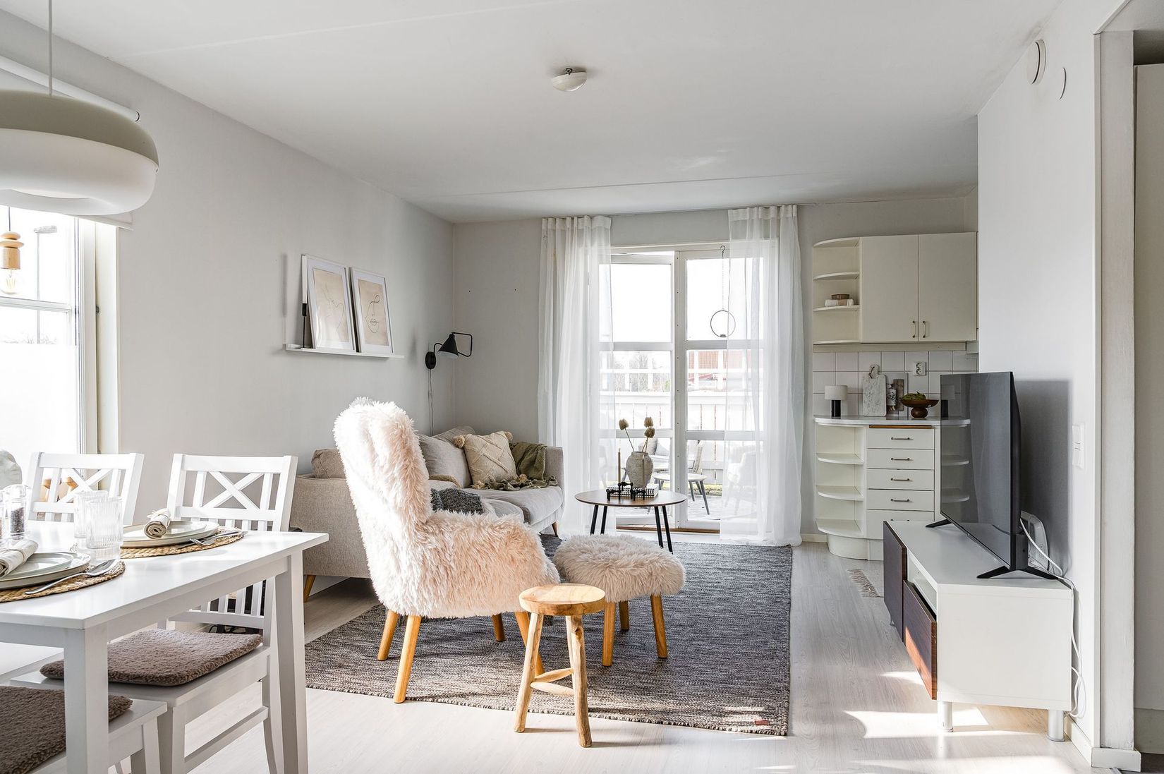Kök och vardagsrum ligger i öppen anslutning till varandra vilket ger en social och trevlig yta där det finns gott om plats för både matbord och en bekväm loungehörna. Från vardagsrummet når du bostadens rymliga uteplats, en härlig förlängning av hemmet under årets varmare månader. Uteplatsen är till viss del insynsskyddad och erbjuder en trivsam plats för avkoppling, umgänge eller en kopp kaffe i solen.