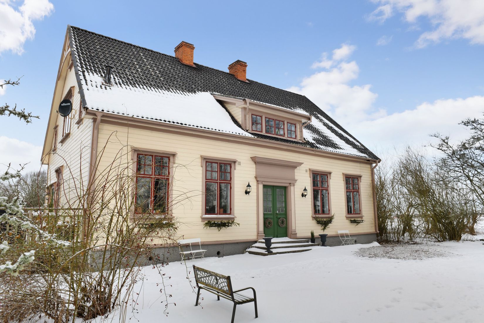 Själva huset är fullt av karaktär – snickarglädje, vackra detaljer och en färgsättning som känns både genomtänkt och hemtrevlig. Man välkomnas in i huset via en av entréerna och en passage som sträcker sig genom hela nedervåningen. I hallen har gjutjärnsdörrarna till det gamla centralvärmesystemet bevarats och utgör ett fint blickfång. Takhöjden på denna våning är hela tre meter och i varje rum finns höga fönster vilket bidrar till en luftig känsla. Alla element i huset är i gammal, tidsenlig stil och på golven ligger fina plankgolv. Vid groventrén finns köket; ett rum för trevligt umgänge och goda måltider, här är plats för ett rejält matbord att samlas runt. Från hallen nås även ett sovrum, klädkammare, duschrum samt tvättstuga. I andra änden av huset hittar man vardagsrummet i vinkel. Här ryms både soffgrupp och matsalsmöbel och en braskamin som ger extra värme och stämning. På detta plan finns ytterligare en entré med vackra dubbeldörrar och fint klinkergolv i original. Via en bred trappa kommer man upp på ovanvåningen. Även på detta plan är det högt i tak och plankgolven återkommer också här. Från en liten hall nås till höger ett rymligt allrum och ett mysigt sovrum. Till vänster återfinns två mindre sovrum samt huvudsovrummet med platsbyggd garderob. Ett badrum finns här också.