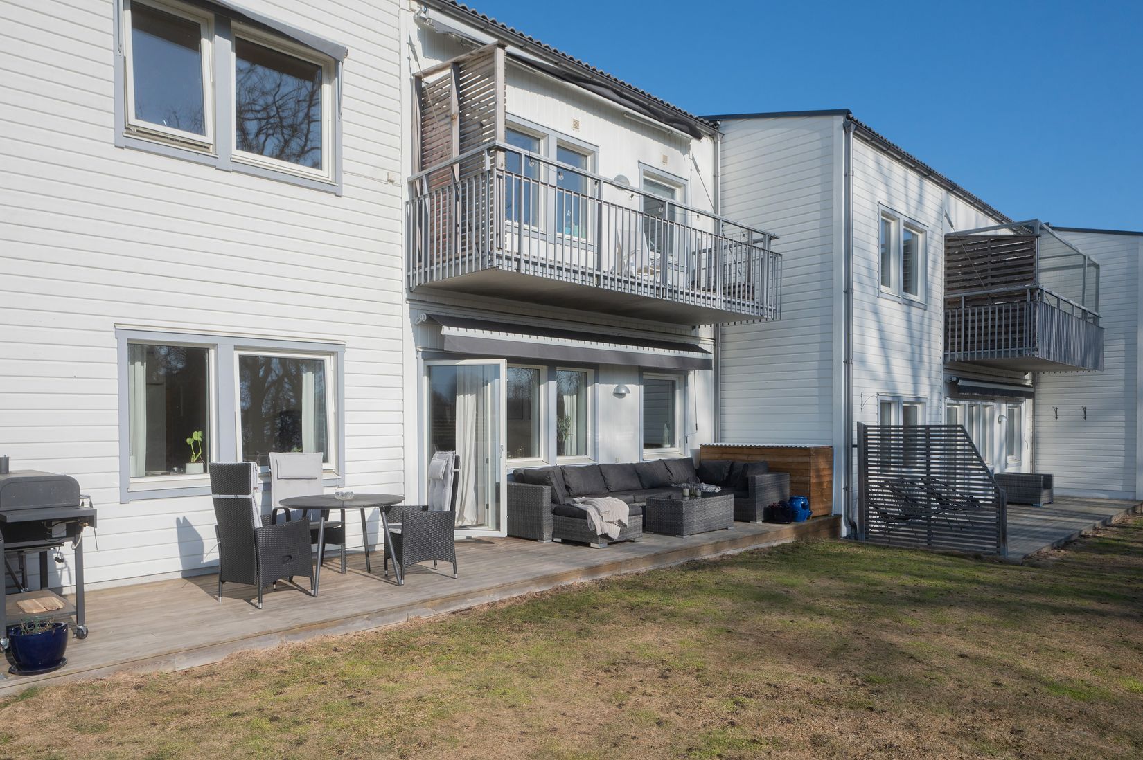 Här möts du av en imponerande trädäckad uteplats i soligt söderläge där solen når stora delar av dagen. Uteplatsen rymmer enkelt både loungemöbler, matgrupp och odlingar och blir en naturlig samlingsplats under årets varmare månader. Till lägenheten hör dessutom en generös gräsyta som skapar en privat och luftig känsla, perfekt för familjeliv, lek eller avkoppling i grönskan. Precis utanför breder en stor äng ut sig som leder vidare ner mot vackra Ågestasjön och förstärker den naturnära känslan direkt utanför dörren.