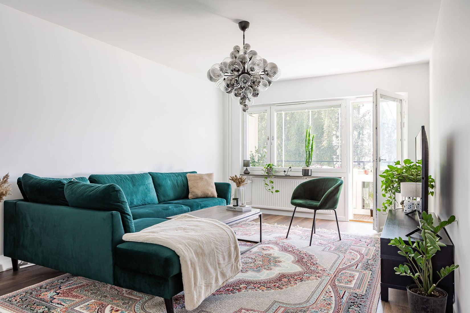 Det rymliga vardagsrummet är lättmöblerat och bjuder på en harmonisk känsla med stora fönster som släpper in rikligt med ljus. Härifrån nås den soliga, inglasade balkongen – en naturlig förlängning av bostaden som kan nyttjas under större delen av året. Köket är modernt och stilrent med mörkgråa skåpluckor, smakfullt vitt kakel och generösa arbetsytor. Här finns plats för matgrupp vid fönstret och utrustningen är komplett för den matlagningsintresserade.