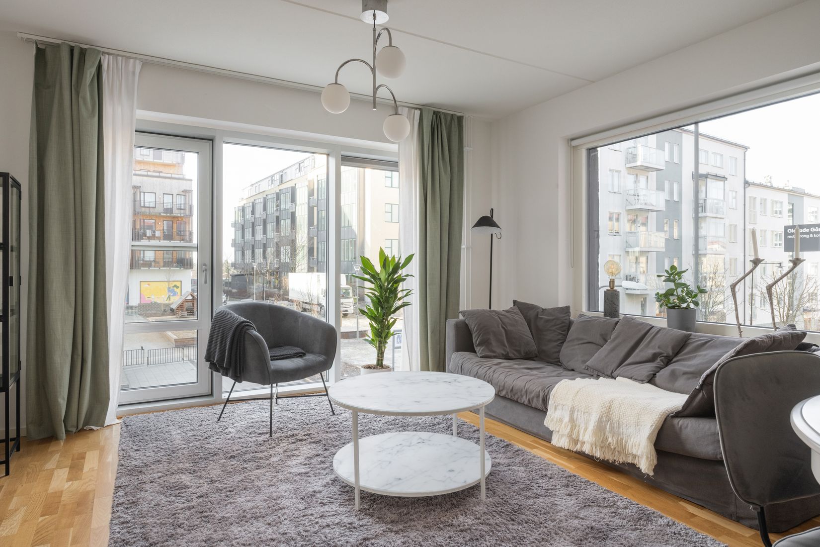 Välkommen till en genomtänkt och trivsam 2,5:a om 63 kvadratmeter, belägen i ett modernt hus från 2020, där stilrena materialval och en effektiv planlösning skapar ett hem att trivas i. Högst upp i samma port hittas föreningens gemensamma takterrass med milsvid utsikt och sol hela dagen. Lägenheten har två södervända franska balkonger mot Radiusparken, vilket ger ett fint ljusinsläpp och en luftig känsla genom bostaden. Här möts man av en varm och harmonisk interiör med genomgående ekparkett och fönsterbrädor i sten. Planlösningen är öppen mellan kök och vardagsrum – en social yta där matlagning, middagar och umgänge naturligt får ta plats. Köket är modernt och funktionellt med goda arbetsytor och rostfria vitvaror. Sovrummet ligger rofyllt och rymmer enkelt både dubbelsäng, sängbord och förvaring. Intill finns ett mindre rum med dagsljus via takfönster, som idag används som barnrum men lika gärna kan fungera som arbetsrum eller walk in closet. Hallen är välplanerad med garderober som ger goda förvaringsmöjligheter. Badrummet är helkaklat i en stilren och tidlös utformning och utrustat med kombinerad tvättmaskin och torktumlare. Lägenheten ligger ovanpå trapphus med högt i tak, vilket ger ett högt och fritt läge. Här bor man bekvämt med hiss, diskmaskin, kombimaskin och garage i fastigheten.
