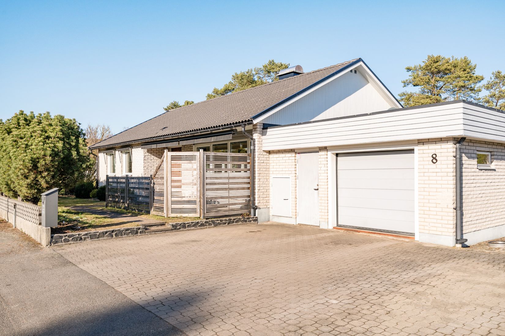 Exteriört väntar en trevlig och uppvuxen trädgård med fina uteplatser. Här finns ett trädäck samt en insynsskyddad uteplats med tegelväggar som skapar en ombonad känsla – nästan som ett öppet uterum. På tomten finns även garage med elektrisk carport samt förråd, vilket ger både praktisk parkering och bekvämlighet i vardagen.