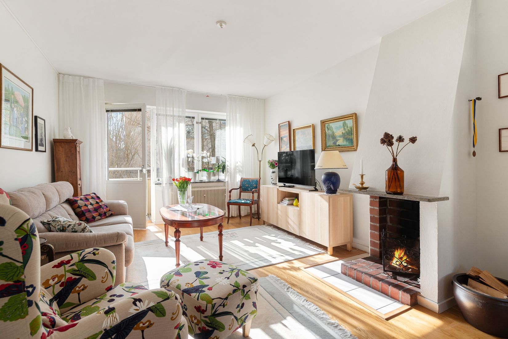 Den öppna planlösningen skapar en härlig social yta där kök, matplats och vardagsrum smälter samman på ett naturligt sätt. Vardagsrummet erbjuder goda möbleringsmöjligheter och pryds dessutom av en öppen spis som bidrar med både charm och trivsel. Köket är renoverat och fullt utrustat med all maskinell utrustning samt en elegant bänkskiva i sten. Lägenheten erbjuder även ett väldisponerat sovrum, ett stort helkaklat badrum samt en yteffektiv hall med bra förvaring. Till bostaden hör dessutom ett rymligt vindsförråd.