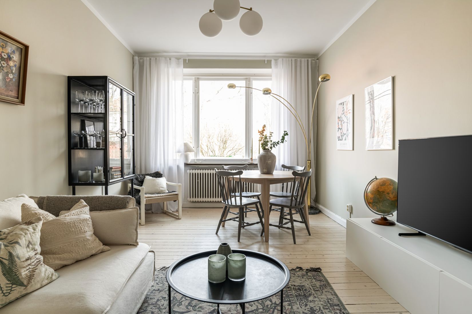 Här erbjuds ett smakfullt renoverat kök med ljusa skåpluckor och eleganta mässingsdetaljer, där det stora fönstret släpper in ett härligt ljus som skapar en trivsam och inbjudande atmosfär. Vidare erbjuds ett ljust vardagsrum med stora fönsterpartier, generös takhöjd och vacker takrosett. Här finns plats för både soffgrupp och matplats. Sovrummet är rofyllt med utsikt mot innergården och här erbjuds högt i tak, en inbyggd bokhylla samt god förvaring i skjutgarderober. Badrummet är stilrent och renoverat i samband med föreningens stambyte 2010/2011.