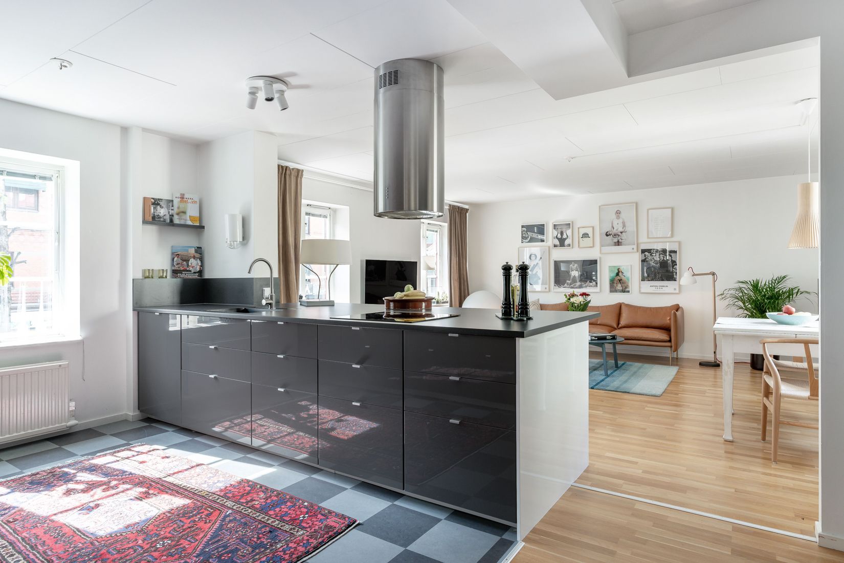 Bostaden erbjuder en öppen och social planlösning mellan det moderna köket och vardagsrummet, med genomgående parkettgolv som skapar en enhetlig och stilren känsla. Det rymliga badrummet har plats för egen tvättmaskin. Lägenheten är tyst och trivsam trots det centrala läget, med möjlighet att ha fönstren öppna mot innergården.