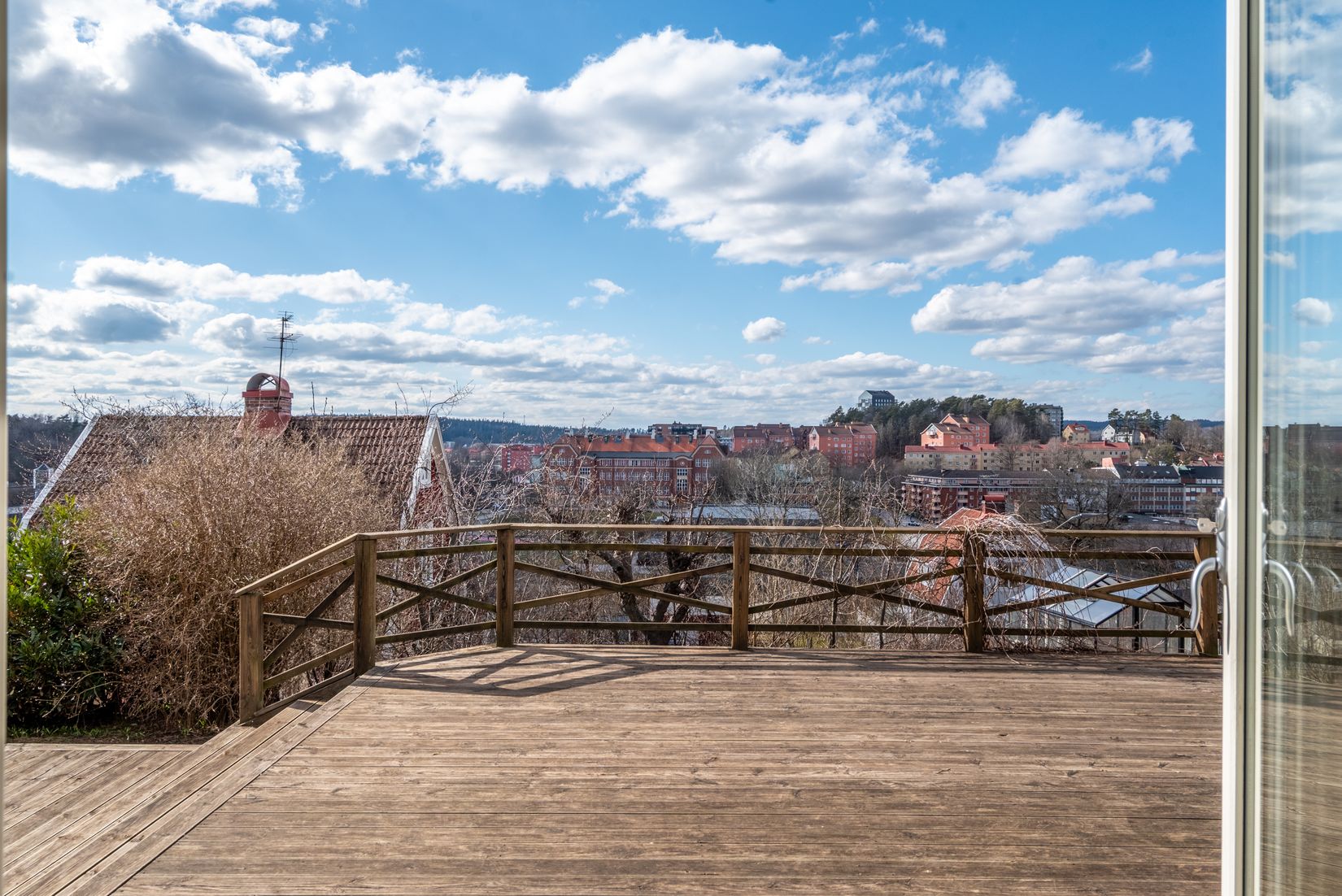 På den stora altanen finns gott om plats för umgänge, middagar och avkoppling under årets varmare månader. Här ifrån har ni fantastisk, högt placerad utsikt där ni ser ut över Borås- en vy som verkligen höjer boendekänslan.