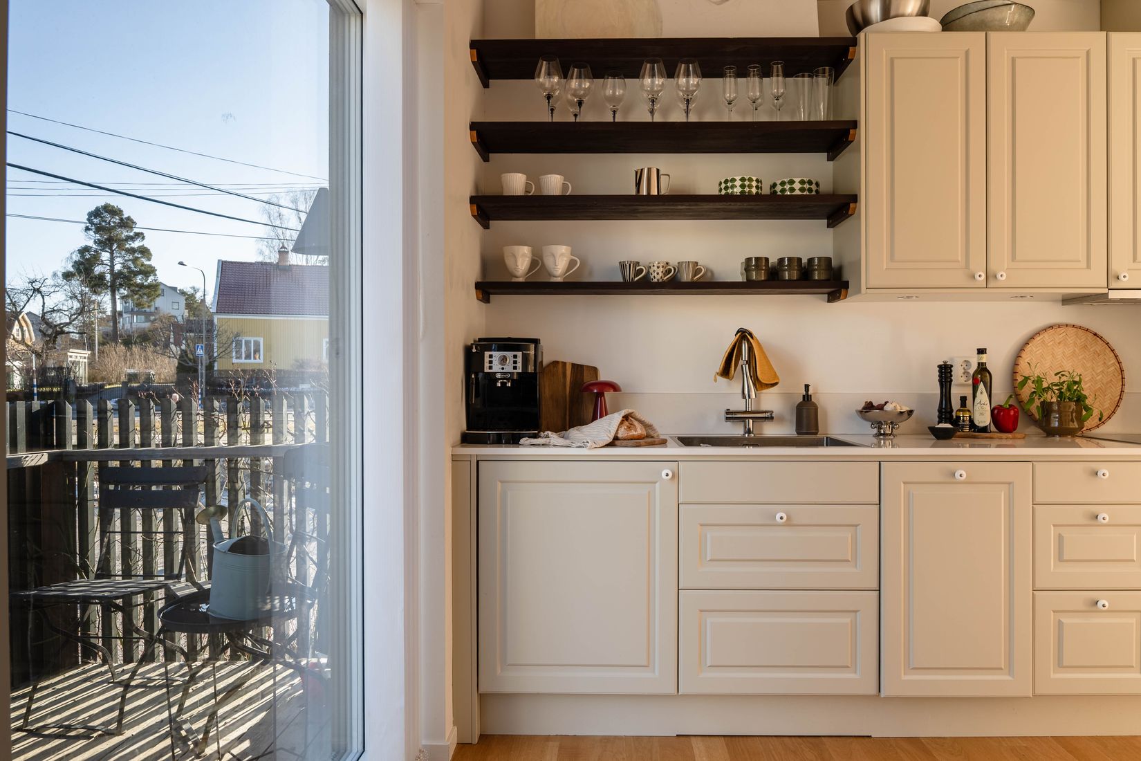 Vägen hem går uppför en egen trappa till en liten uteplats - en naturlig plats för morgonkaffet eller en stund i solen innan dagen börjar. Innanför dörren möts du av ett hem där allt fortfarande känns nytt och väl omhändertaget. Vattenburen golvvärme löper genom hela bostaden och ger en behaglig värme utan synliga radiatorer.