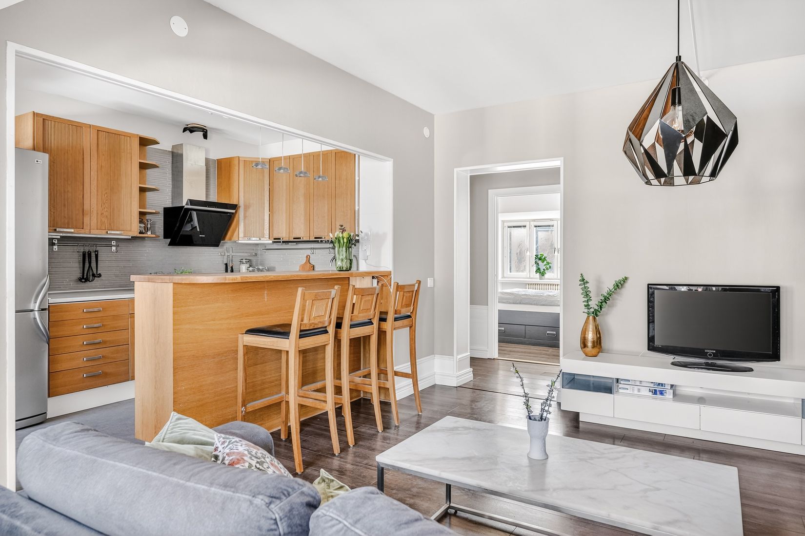 Lägenheten erbjuder dessutom två sovrum i bra storlek, praktisk förvaring och ett badrum med tvättmaskin. Planlösningen är genomgående, vilket bidrar till ett fint ljusflöde och en harmonisk känsla genom hela bostaden.