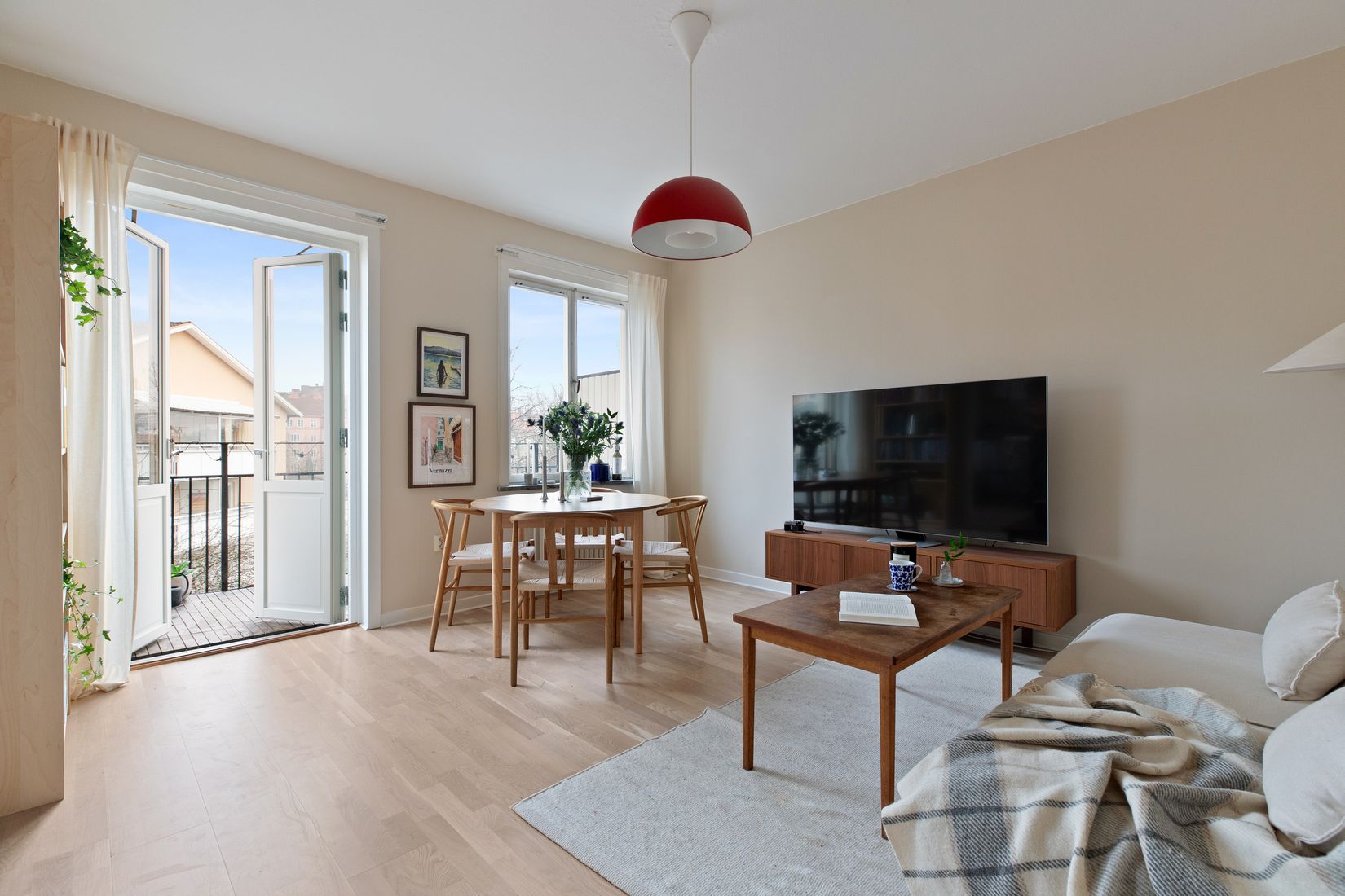 Denna välplanerade tvårummare erbjuder ett fint ljusinsläpp från fönster i två väderstreck och en rymlig balkong som vetter mot den lummiga och den grönskande tomten med gräsmatta och flera fruktträd. Här bor du med en rogivande utsikt i en trivsam och ombonad miljö.
