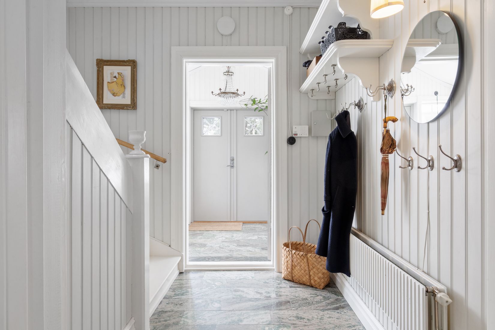 Redan i hallen möts du av en slående vacker kolmårdsmarmor, vidare in i huset ligger det rymliga köket där familj och vänner kan samlas. I vardagsrummet står en ståtlig kakelugn som bidrar till både uppvärmning och trivsam atmosfär.