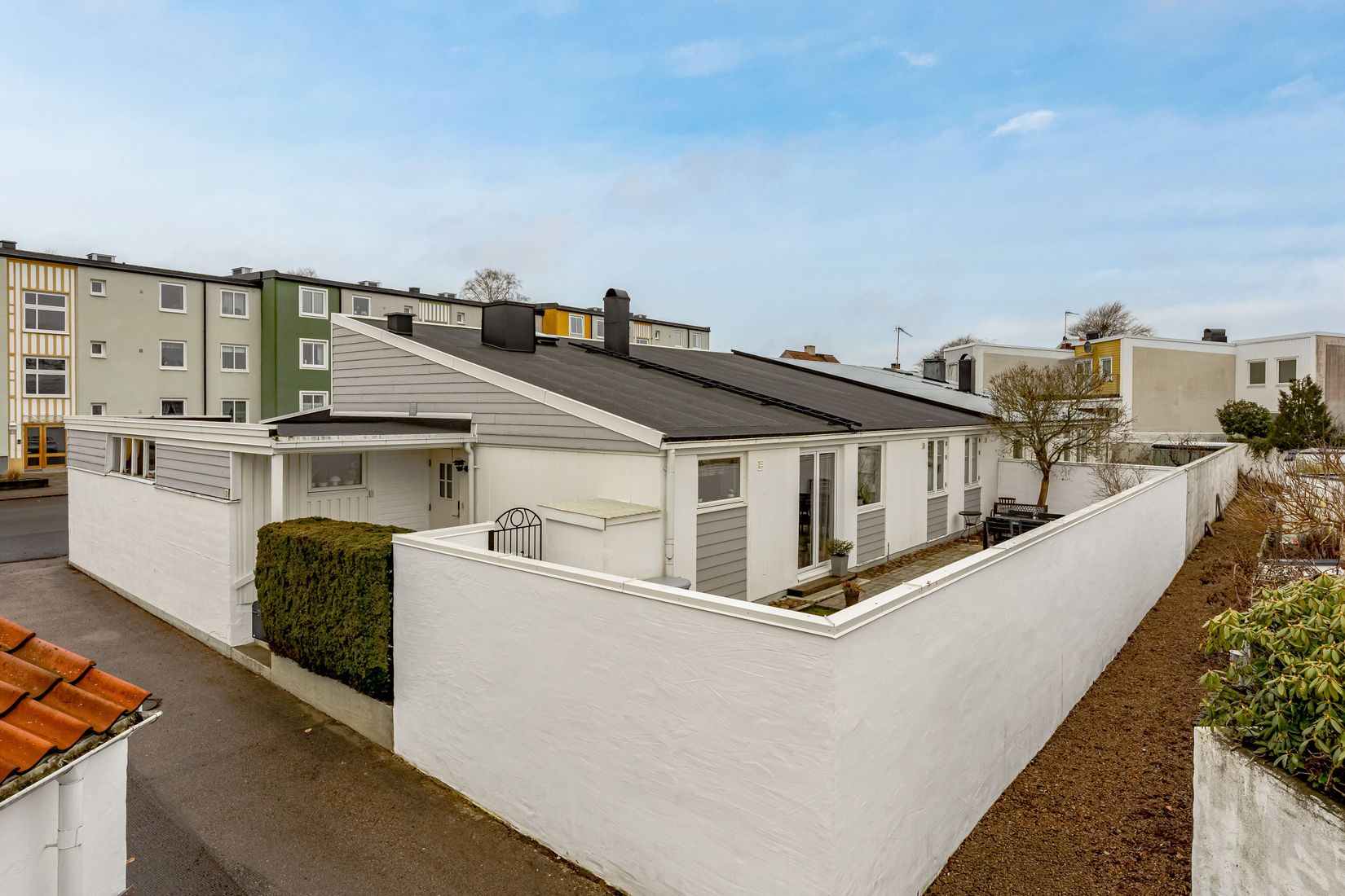 Planlösningen är flexibel och passar både mindre och större familjer. I dagsläget finns två sovrum, men huset kan med enkelhet göras om till fler vid behov. Sovloftet skapar ytterligare möjligheter – perfekt som extra sovplats, barnens myshörna eller smart förvaring. Till bostaden hör två insynsskyddade mindre trädgårds-/atriumgårdar som kräver minimalt underhåll och ger fina uterum att njuta av året runt. Det egna garaget, med direktanslutning till huset, gör vardagen både smidig och praktisk.