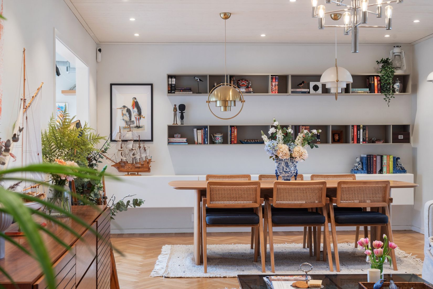 Det stilfulla vardagsrummet med vacker fiskbensparkett och braskamin skapar en varm och inbjudande känsla. Det nyrenoverade, lyxiga köket är fullt utrustat med vinkyl, ångugn, skafferi och en rejäl köksö med förvaring i exklusiv kompositbänkskiva. Perfekt för både vardag och fest.
