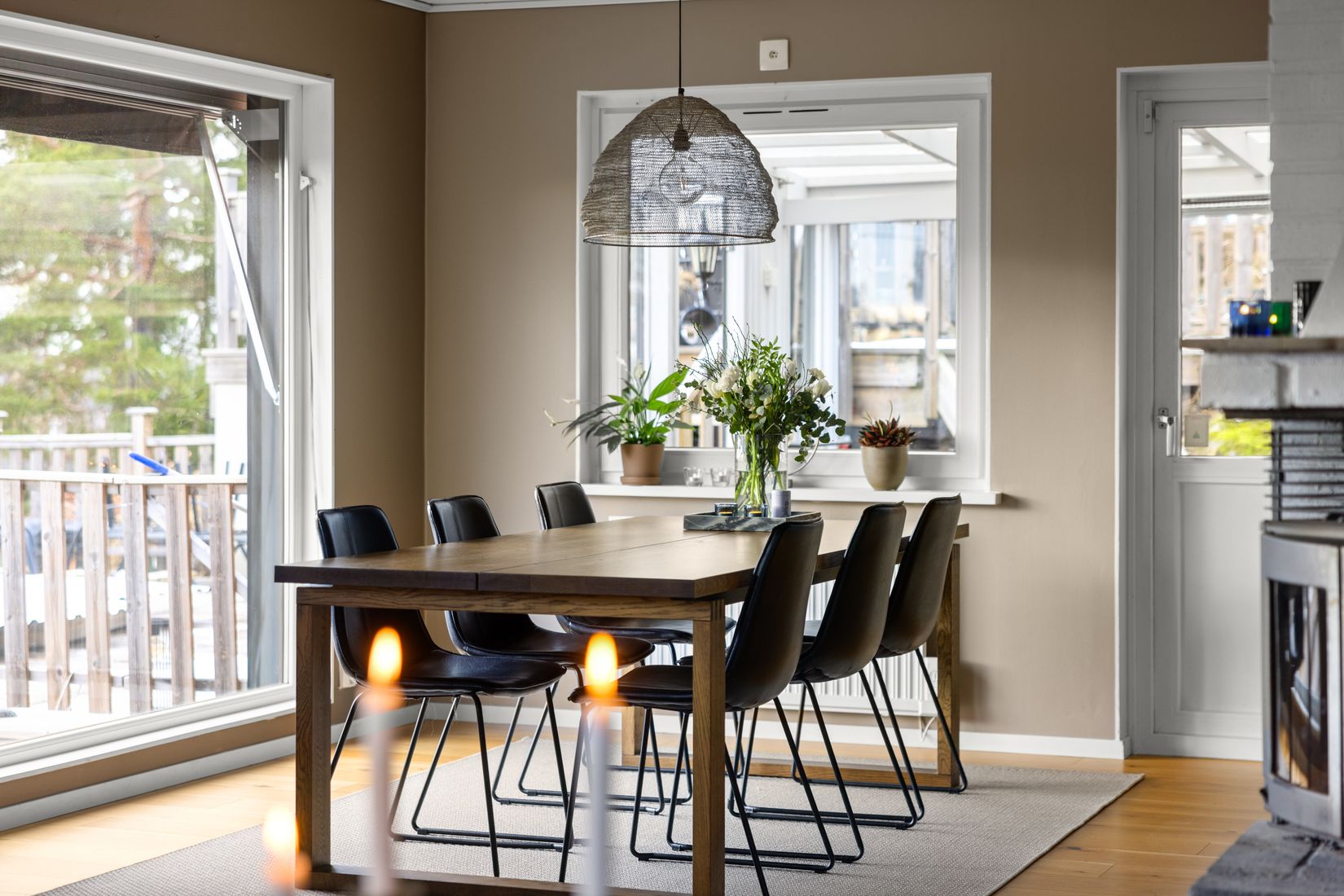 Från köket nås utgång till uterummet som leder vidare till utemiljöerna av högsta rang. Här finns allt som kan önskas under sommarhalvårets månader. Njut av ett dopp i den uppvärmda poolen, sola på någon av de 140 kvm terrass i två nivåer eller förbered kvällens grillning med plats för det stora sällskapet i kvällssolen.