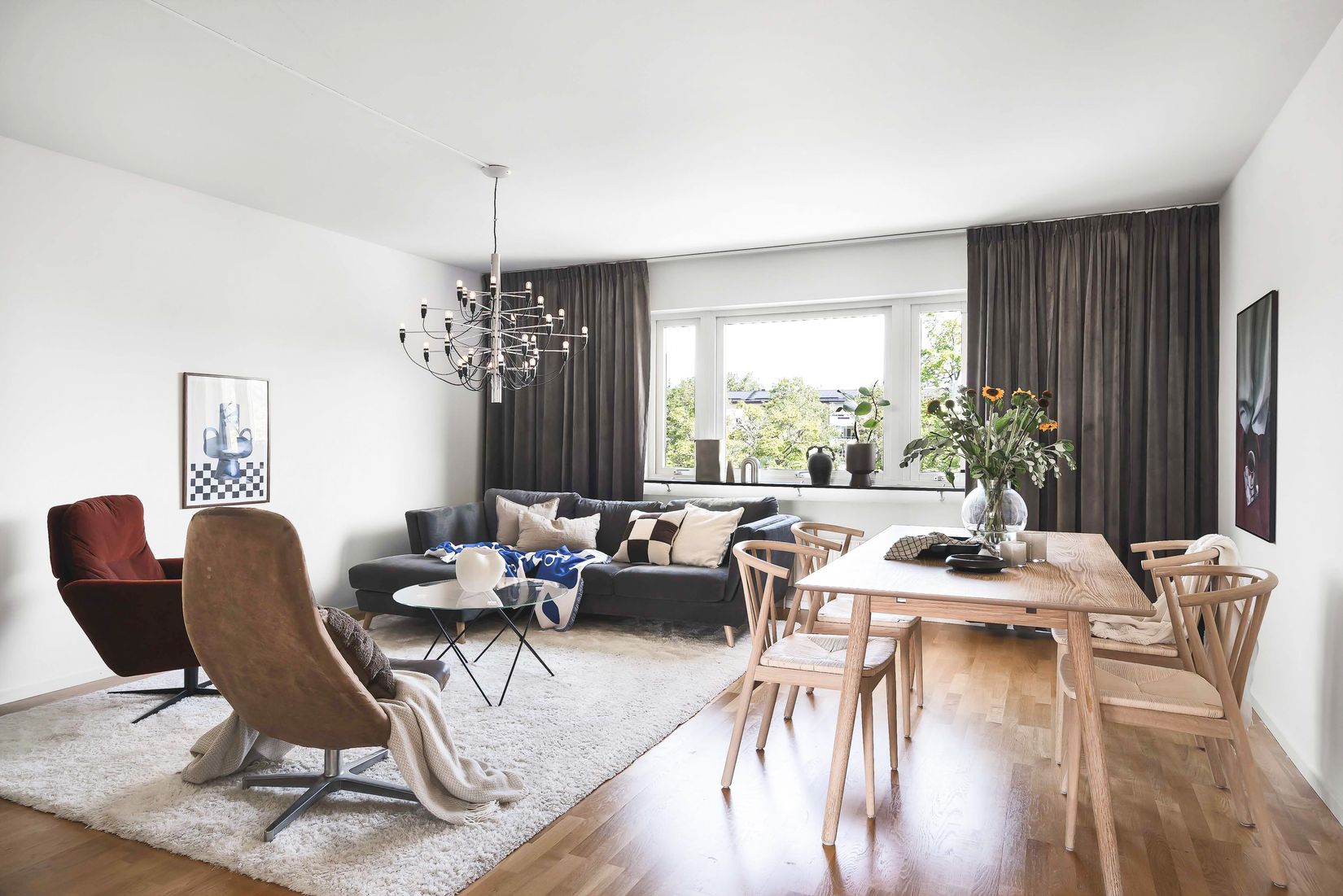 Bostaden präglas av ljusa och välplanerade ytor där planlösningen skapar en naturlig balans mellan sociala sällskapsytor och privata rum. Det rymliga vardagsrummet bjuder in till umgänge och erbjuder gott om plats för både soffgrupp och matplats. I anslutning till köket finns ytterligare plats för matbord, och härifrån nås även bostadens härliga balkong. Köket är smakfullt inrett med bra arbetsytor samt fullstor kyl och frys. Intill köket finns ett praktiskt utrymme där det idag är installerat en tvättmaskin, men som lika väl kan användas som skafferi eller extra förvaring efter behov.