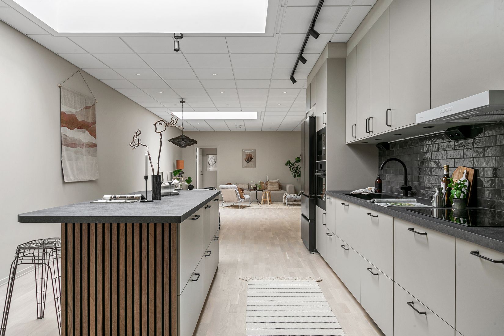 Bostaden välkomnar med en hall med plats för klädavhängning. Det rymliga master bedroom erbjuder gott om plats för större säng, skrivbord och exempelvis en mindre sittgrupp. Köket är stilrent utformat med köksö och ligger i öppen planlösning mot det generösa vardagsrummet där både soff- och matgrupp ryms utan problem. Takfönstren ger ett fantastiskt ljusinsläpp samtidigt som bostaden upplevs mycket privat med minimal insyn.