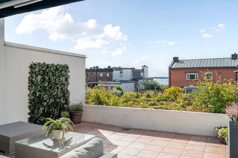 Generösa fönsterpartier och stilfulla industriväggar skapar en ljus och modern atmosfär.. Från lägenhetens vardagsrum når man ut till en solig uteplats i västerläge med utsikt över vackra Öresund, vilket blir en naturlig förlängning av vardagsrummet under sommarhalvåret.