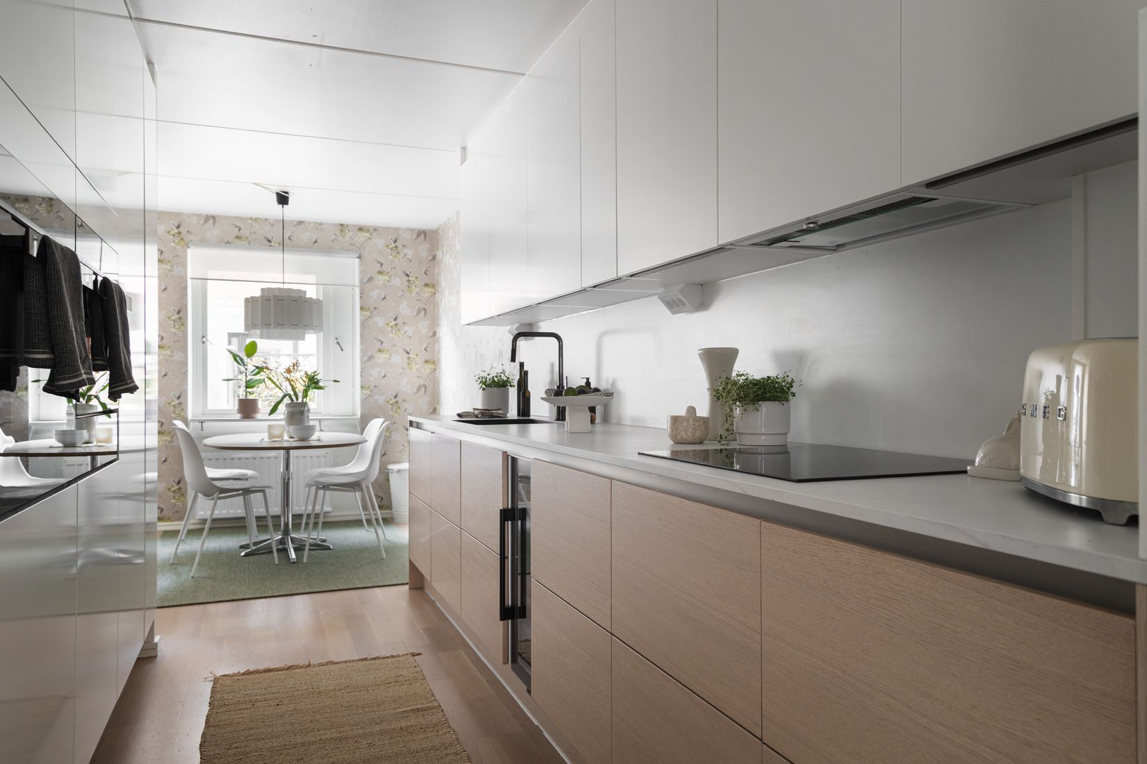 Éntreplan: Ni välkomnas in i en ljus och inbjudande hall med plats för ytterkläder och goda förvaringsmöjligheter i intilligande klädkammare. Härifrån öppnar sig hemmet vidare mot köket och de sociala ytorna där planlösningen skapar ett naturligt flöde mellan rummen. Köket är smakfullt renoverat under 2025 och fullt maskinellt utrustat. Det är praktiskt planerat med gott om arbetsytor och förvaring samt plats för matbord. Vardagsrummet är generöst tilltaget och bjuder på ett fint ljusinsläpp från fönster mot baksidan. Här finns gott om plats för både soffgrupp och matsalsdel, vilket gör rummet till hjärtat i hemmet. Från vardagsrummet nås den trälagda altanen på baksidan – en härlig och social uteplats med plats för utemöbler, middagar och avkopplande stunder med familj och vänner. På entréplanet finns även ett stilrent renoverat badrum utrustat med dusch och wc.