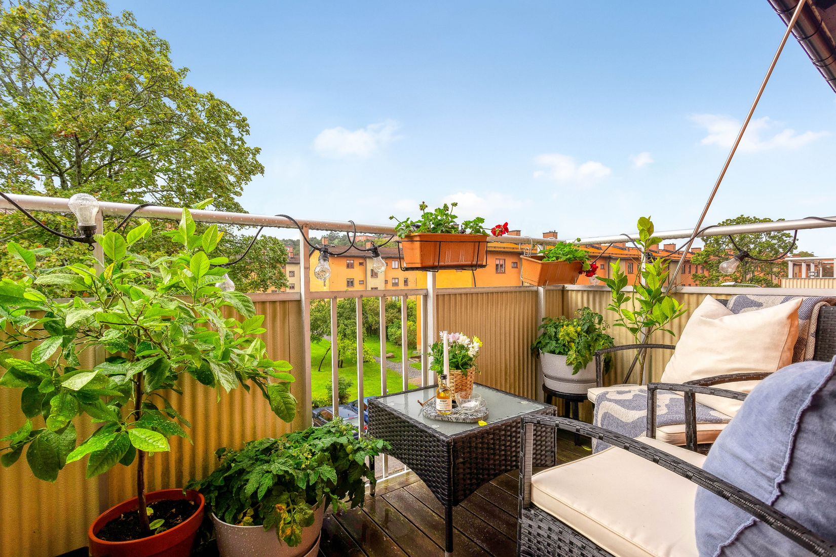 Vardagsrummet är ljust och luftigt och härifrån når du balkongen med sitt fria söderläge mot grönskande innergård. I hallen finns plats för avhängning och förvaring, och längre in i bostaden finns en praktisk klädkammare. Badrummet är stilfullt renoverat och utrustat med tvättmaskin, dusch, handfat med kommod, badrumsskåp, WC och handdukstork. Även köket är smakfullt renoverat med goda arbetsytor och plats för matbord för 4–6 personer. Det rymliga sovrummet rymmer enkelt en stor dubbelsäng med sänggavel och garderober.