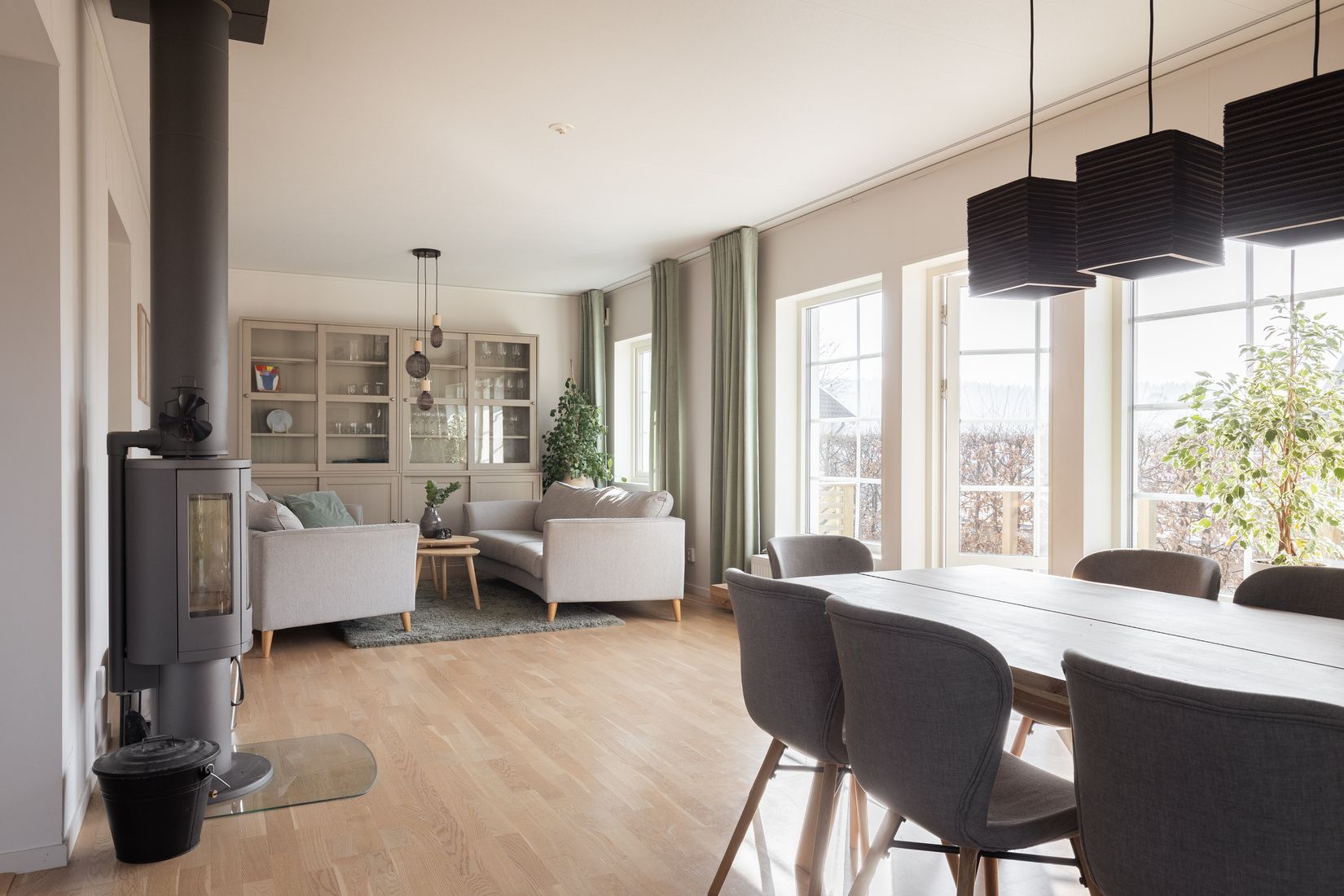 Redan när du kliver in möts du av en öppen och inbjudande planlösning där kök, matplats och vardagsrum samspelar på ett naturligt sätt. De stora fönsterpartierna och altandörrarna släpper in rikligt med dagsljus och skapar en härlig kontakt med utemiljön. Vardagsrummet bjuder på en varm och trivsam känsla där den stilrena kaminen blir en naturlig samlingspunkt under årets kallare månader.