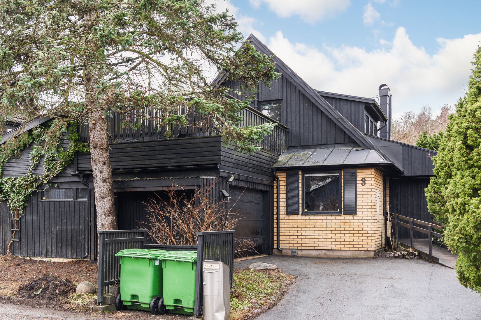 På övre plan ligger tre sovrum samlade tillsammans med ytterligare sällskapsyta. Härifrån nås dessutom två stora balkonger som nästan känns som små takterrasser – perfekta platser för morgonkaffet, kvällssolen eller en stund i lugn och ro ovanför trädgården.