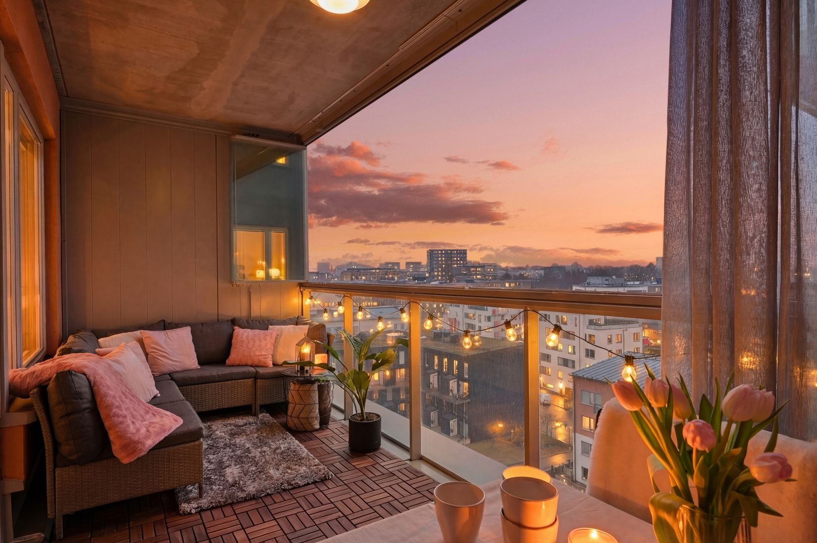 Kök och vardagsrum möts i en delvis öppen planlösning som ger ett luftigt och inbjudande intryck. Här finns gott om plats för både matplats och soffgrupp vilket gör ytan perfekt för såväl vardag som sociala tillställningar. Från vardagsrummet når ni bostadens verkliga höjdpunkt, den imponerande inglasade balkongen som fungerar som ett extra sällskapsrum under stora delar av året. Den generösa storleken ger utrymme för både soffgrupp och matbord och skapar en perfekt plats för avkoppling och umgänge.
