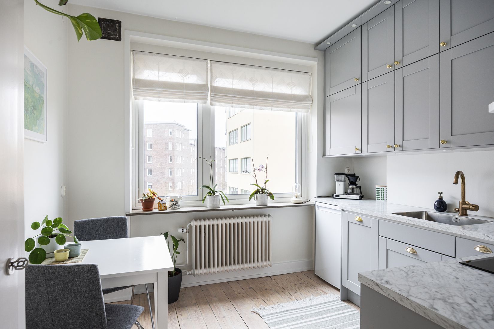 Köket från Vedum förenar modern standard med charmiga detaljer och är utrustat med marmormönstrad bänkskiva, beslag i mässing, diskmaskin samt ett bevarat inbyggt skafferi som ger extra förvaring och själ. Här finns även en naturlig matplats och vitvaror som uppdaterats löpande, senast med nytt kylskåp 2025. Det stilrena, helkaklade badrummet går i klassiskt vitt och mörkt klinker med modern inredning från Macro Design och blandare från Tapwell. Hallen välkomnar med ljusa färgval, inbyggd garderob och en rejäl säkerhetsdörr för ökad trygghet. Utöver den smarta förvaringen i lägenhetens klädkammare disponeras även stora förråd på både vind och i källare.
