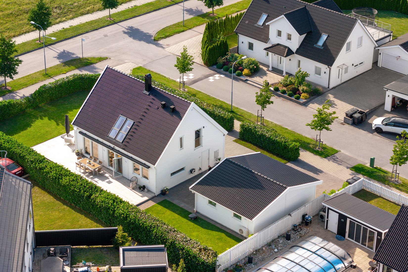 Den väl tilltagna hörntomten om 730 kvm har ett fritt sydvästläge med sol från morgon till sen kväll. Uteplatserna löper längs husets södra och västra sida och är både generösa och insynsskyddade- perfekta för såväl avkoppling som sociala tillställningar. Trädgården erbjuder plana gräsytor med gott om plats för lek, studsmatta, odling eller pool och ramas in av en tät lagerhägg (lagerhäck) som ger grönska året runt och effektivt skyddar mot insyn. De lummiga trädraderna längs gatorna bidrar till områdets trivsamma karaktär.