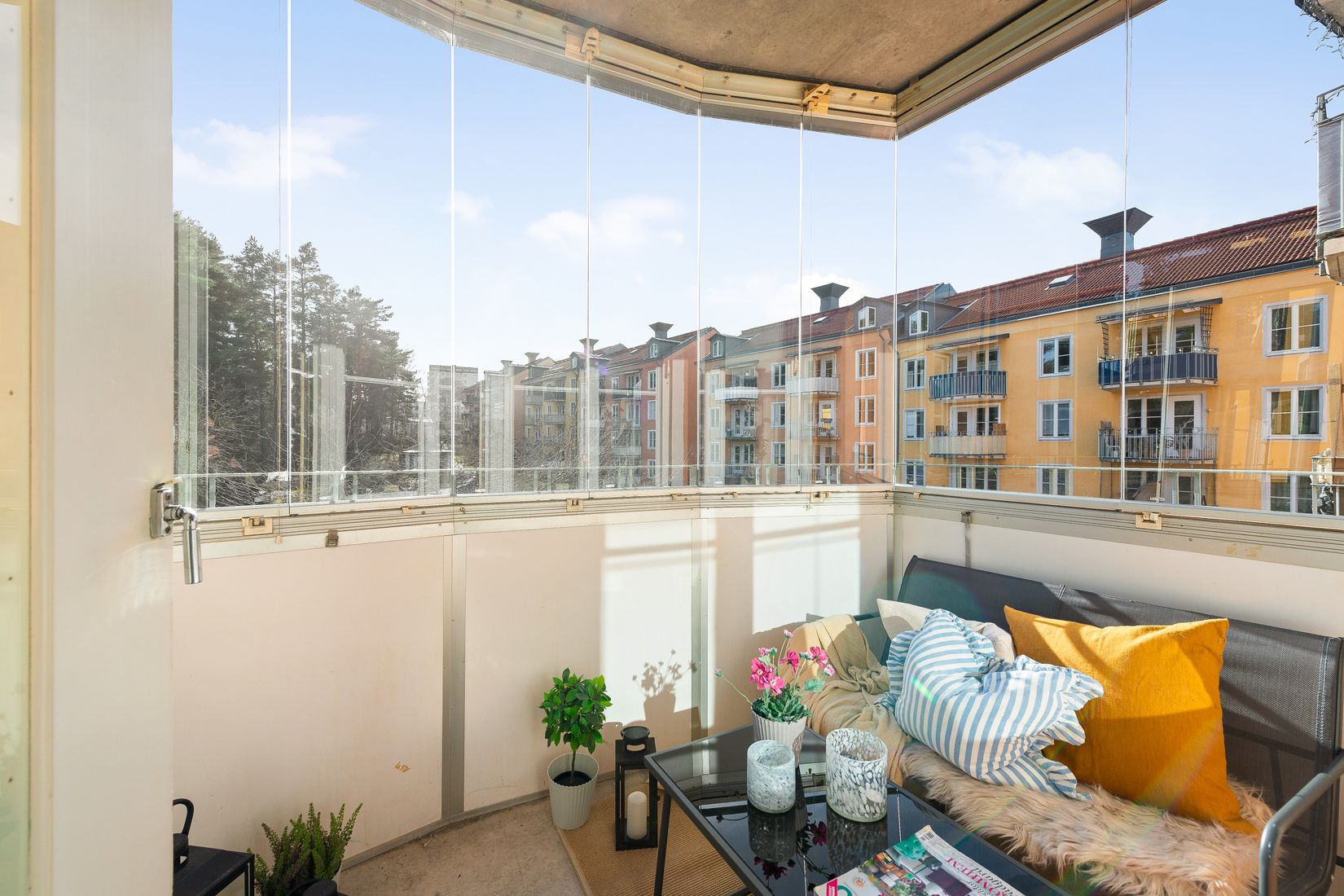 Lägenheten erbjuder ett fullt utrustat kök med diskmaskin samt side-by-side kyl och frys. Från köket nås den soldränkta, inglasade balkongen i söderläge med utsikt över föreningens lummiga innergård.