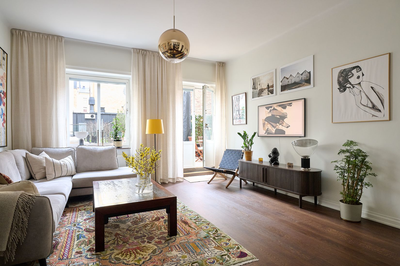 Välkommen till denna smakfulla tvåa där tidstypisk funkischarm möter en modern och social öppen planlösning. Bostaden präglas av härlig rymd, generösa fönsterpartier och ett behagligt ljusinsläpp som skapar en luftig och inbjudande atmosfär. Kök och vardagsrum samspelar fint och bildar en naturlig plats för både umgänge och avkoppling. Här ryms såväl matplats som en generös soffgrupp, perfekt för middagar med vänner och familj. Uteplatsen ramas in av grönskande spaljéer och blir under årets varmare månader en härlig förlängning av bostaden. Här börjar gärna dagen med en kopp kaffe i solen och på kvällarna tänds grillen för långa, trevliga middagar.