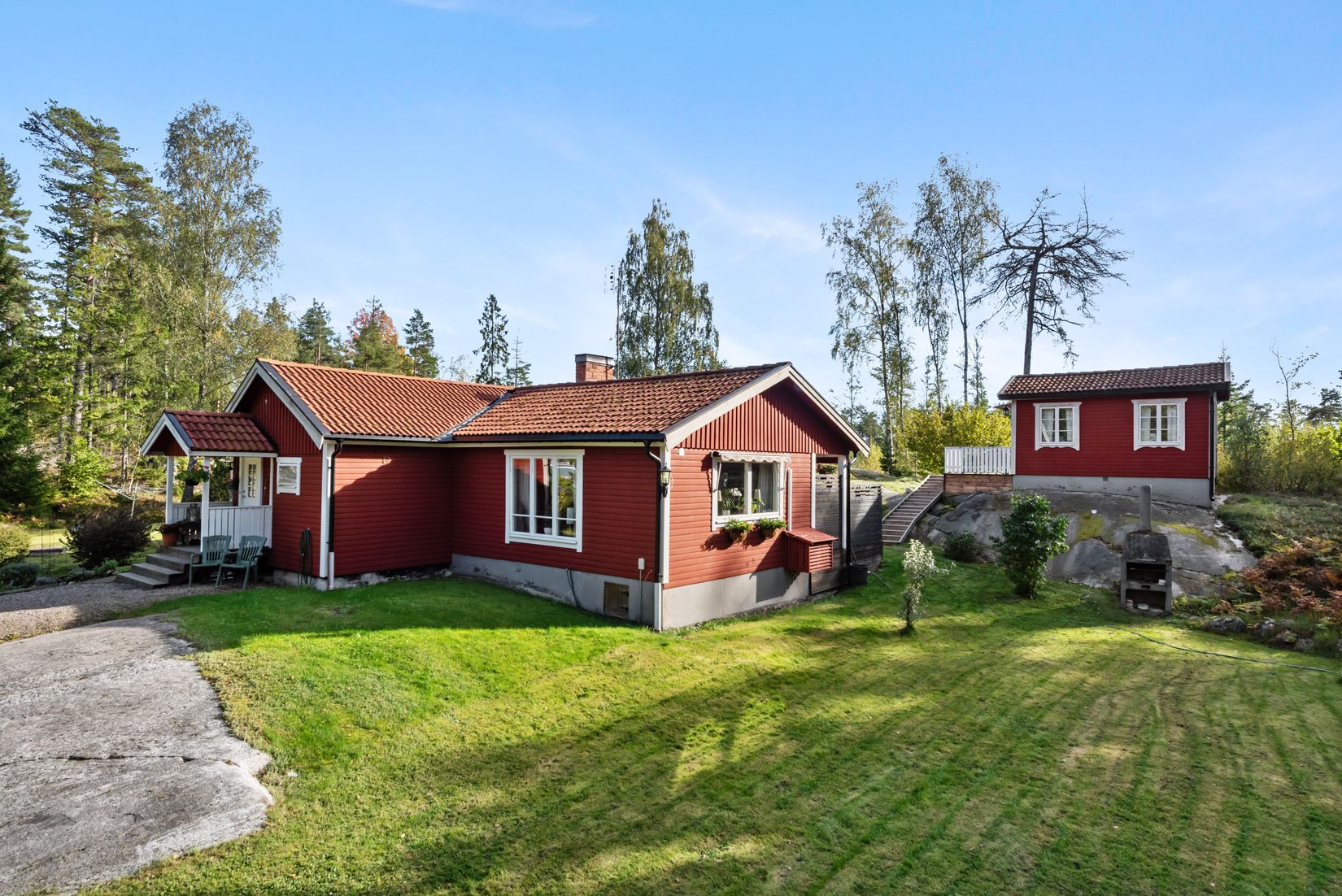 Den 2 357 kvm stora tomten är en härlig blandning av natur- och trädgårdstomt med generösa gräsytor för lek och umgänge. På tomten finns även gäststuga, förrådsbyggnad och vedförråd.