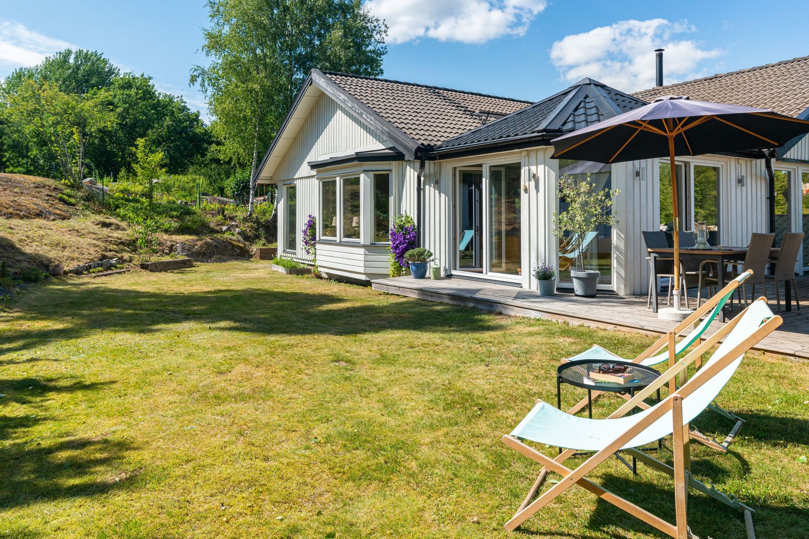 Detta är ett hem som kombinerar modern komfort med ljusa och öppna ytor, en bastu för avkoppling, insynsskyddad trädgård med flera uteplatser och ett fantastiskt solläge.