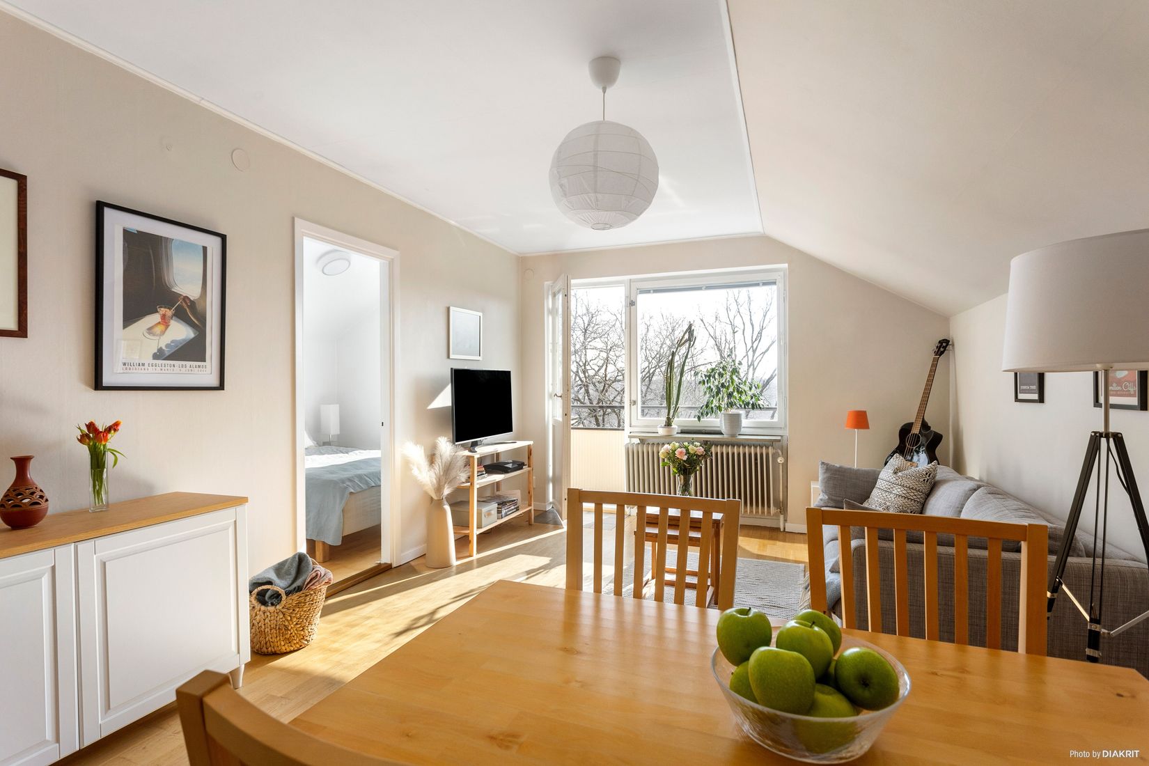 Välkommen till denna charmiga vindsvåning om ca 45m², en perfekt möjlighet för dig som söker ett smart, stilrent och kostnadseffektivt boende. Här möts du av ett välplanerat hem där varje kvadratmeter är omsorgsfullt utnyttjad. Bostaden erbjuder en välkomnande hall med skjutgarderob. Här finns ett praktiskt arbetskök som renoverats i modern stil, med goda arbetsytor och förvaring som gör matlagningen både enkel och inspirerande. Även badrummet är smakfullt renoverat och håller en god standard. Vardagsrummet är tilltaget med plats för både soff- och matgrupp. I anslutning till vardagsrummet finns ett mindre rum som rymmer en dubbelsäng. Från bostadens balkong i attraktivt sydostläge kan du njuta av en härlig vy och soliga morgnar, en perfekt plats för kaffe, avkoppling eller en lugn stund. Här bor du i en välplanerad lägenhet som kombinerar charm, funktion och ekonomi - ett utmärkt val för förstagångsköparen, studenten eller pendlaren som vill ha ett bekvämt och kostnadseffektivt hem med det lilla extra.