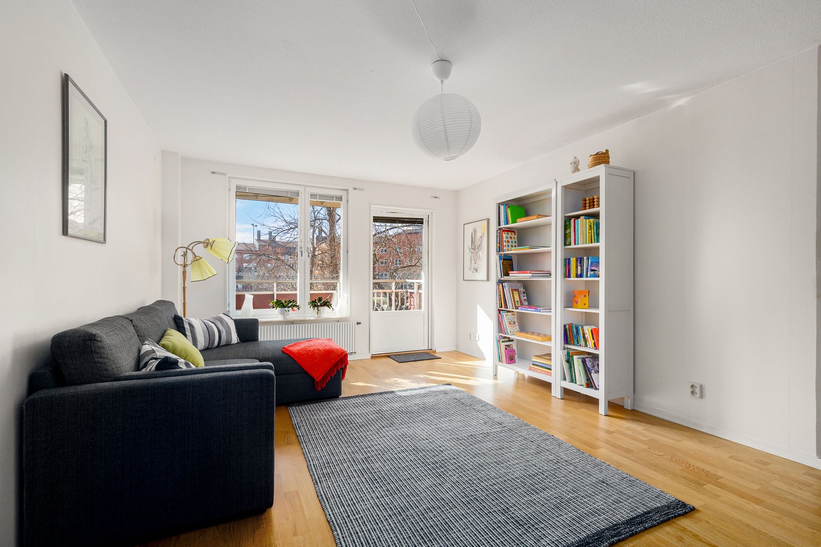 Det rymliga och lättmöblerade vardagsrummet bjuder på stora fönster och generösa sällskapsytor. Härifrån når du den stora balkongen i fint sydvästläge – en perfekt plats för umgänge och avkoppling med plats för utemöbler, växter eller egen odling.