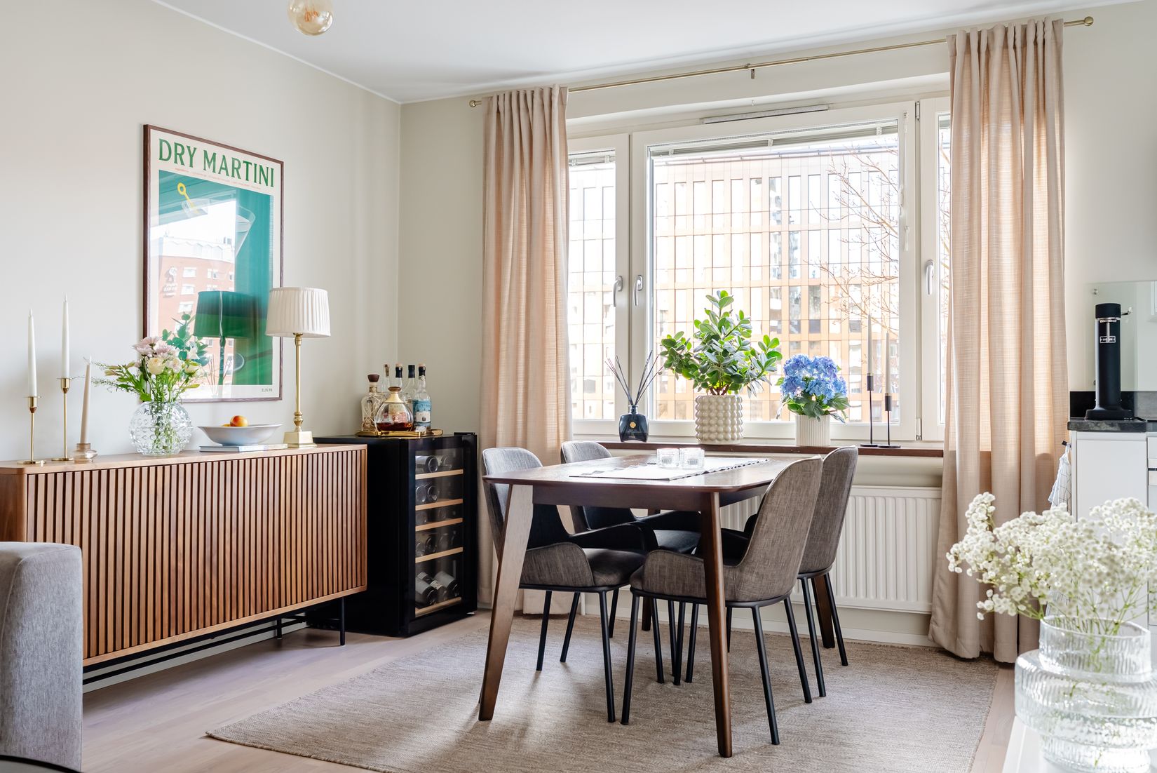 Bostaden präglas av en ljus och välplanerad interiör där den öppna planlösningen skapar en luftig och social atmosfär. Köket är optimerat för sin storlek, i moderna och stilrena materialval – perfekt för både vardagsliv och middagar med vänner.