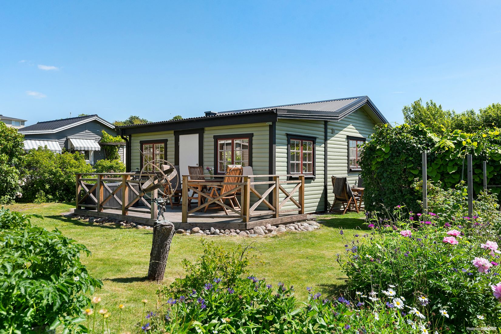 Denna stuga är byggd på 80-talet och har därav ingen källardel. På husets ena gavelsida finns en mysig uteplats med insynsskydd tack vare växtligheten som den omgärdas av.