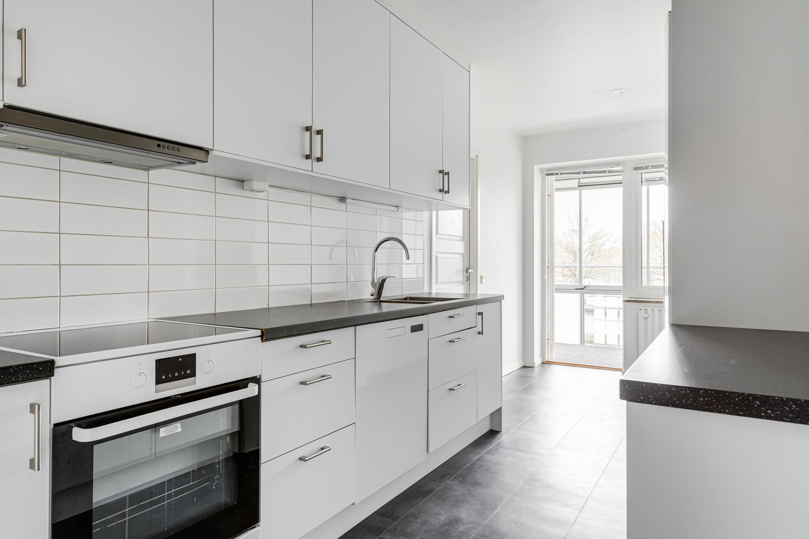 Bostaden präglas av ett enhetligt mörkt golv som löper genom hall, kök och vardagsrum och skapar en modern och sammanhängande känsla. De ljusa väggarna i kombination med stilrena kontraster ger ett hem som är både tidlöst och lätt att trivas i. Köket är funktionellt och smakfullt inrett med vita skåpsluckor, mörk bänkskiva och vitt kaklat stänkskydd. Här finns plats för mindre matbord samt direkt access till den inglasade balkongen – perfekt för morgonkaffet eller en lugn stund på kvällen.